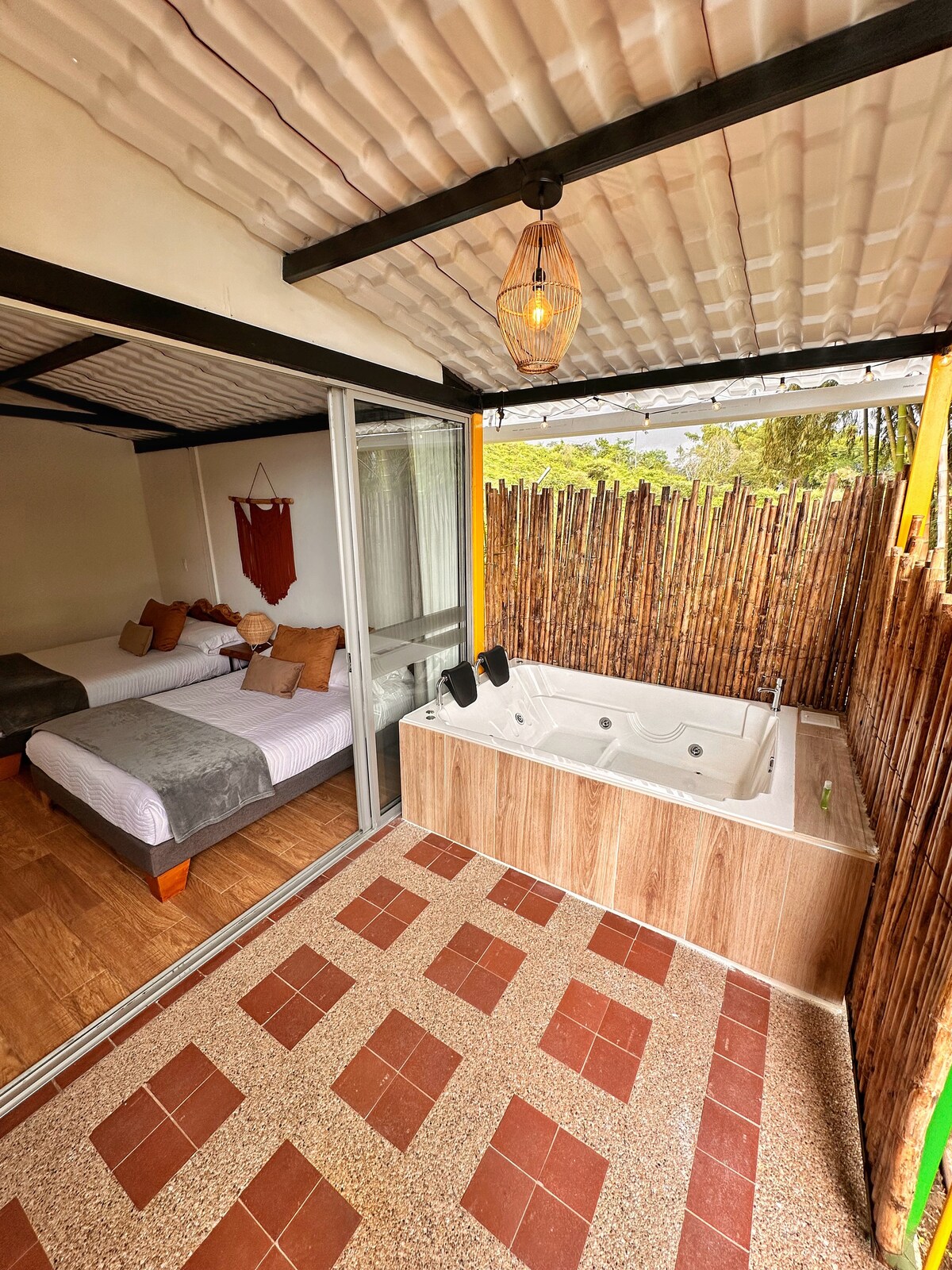 Apartament confortabil de 35 m² cu 3 camere: cameră cu pat dublu și baie privată cu apă caldă, bucătărie complet utilată și cameră confortabilă. Are o curte pavată privată cu jacuzzi pentru relaxare, Wi-Fi de mare viteză și TV. Este locul ideal pentru cuplurile care doresc să se odihnească, să se reconecteze unul cu celălalt și să se bucure de principalele activități din Salento, Quindío. Un spațiu perfect pentru relaxare și explorarea farmecului Eje Cafetero.