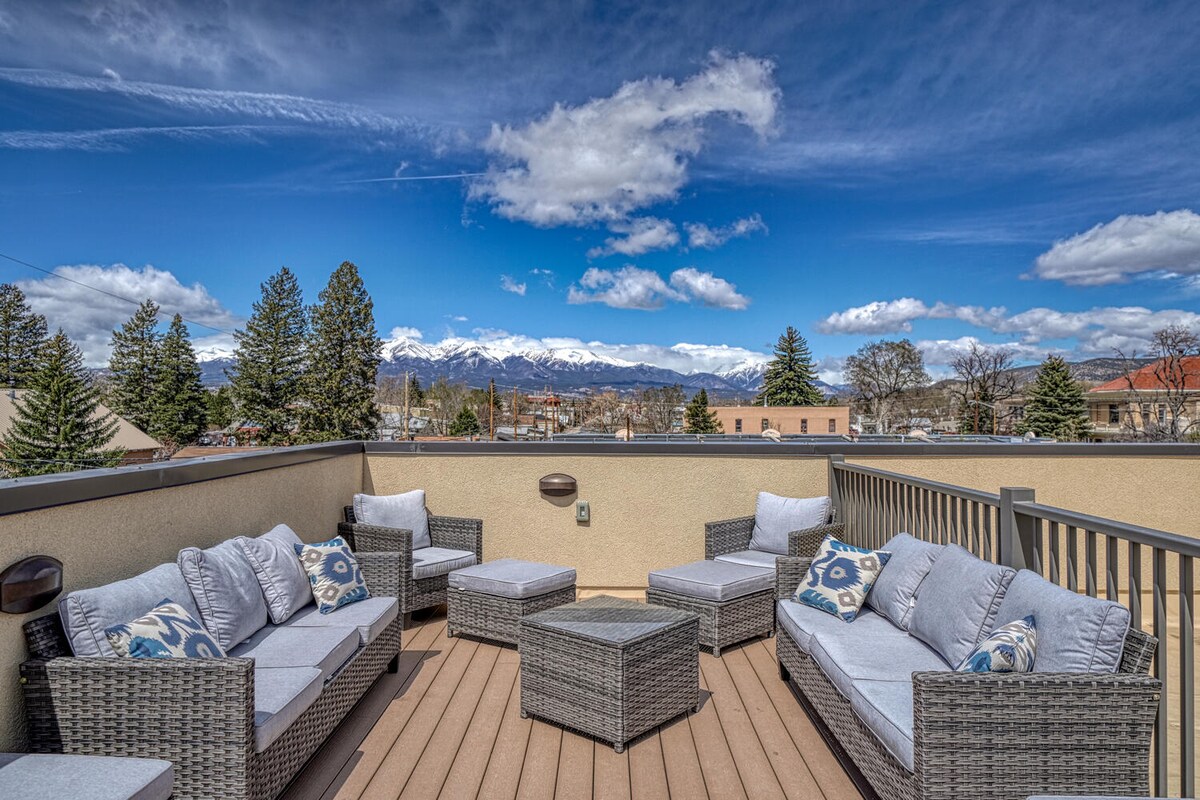 Tabără de aventură în centrul orașului Salida, cu o terasă privată pe acoperiș la etajul 4 și priveliști montane la 360°. Mergi pe jos până la restaurante, cafenea, acces la râu și două magazine alimentare. Perfect pentru familii, excursii la schi și weekenduri cu ciclism sau rafting. Apartament cu pat king-size + cameră cu pat queen-size, birou cu două futonuri, bucătărie complet aprovizionată, grătar, vatră în aer liber, mașină de spălat/uscător și echipament pentru copii incluse. Relaxează-te după zilele petrecute pe Muntele Monarch sau după aventurile de pe râul Arkansas, bucurându-te de priveliștile la apus de pe acoperiș. Salida STR 012026