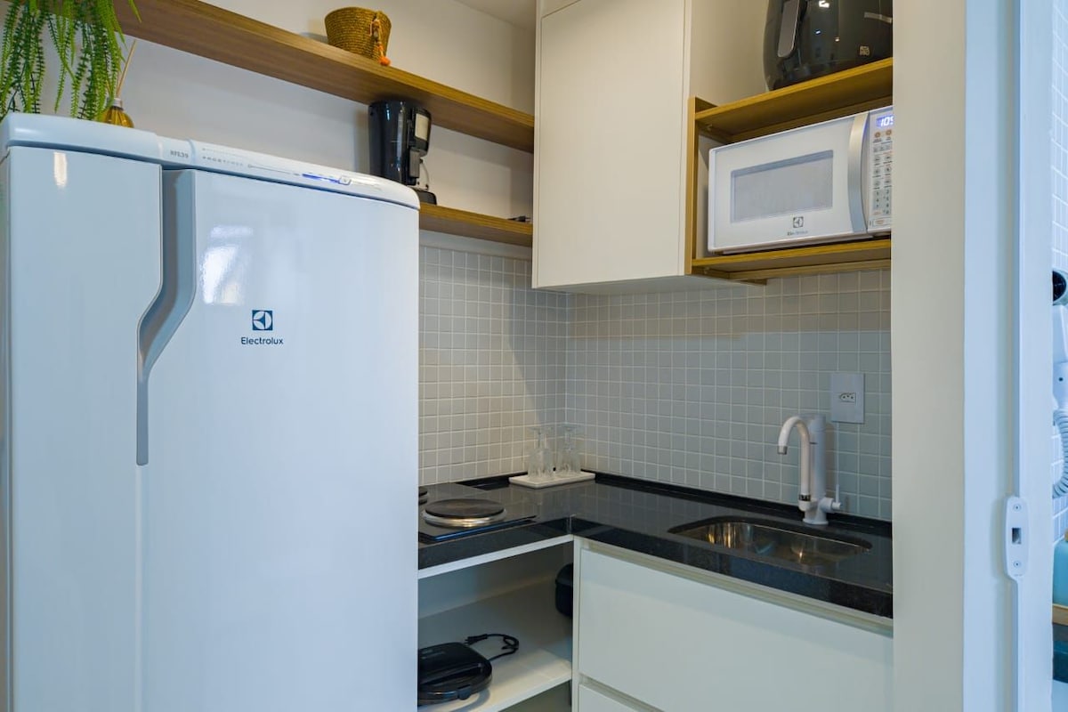 Garsonieră cu living, bucătărie și dormitor. 1 pat dublu, 1 canapea extensibilă. Modern, Styling și Aconchegante. Complex rezidențial bine organizat, cu diverse opțiuni de agrement și o piscină cu vedere la ocean, situat la 200 de metri de plaja Amaralina. Dispune de un televizor Smart cu canale prin cablu, o plită cu 4 arzătoare, un frigider, Wi-Fi de 350 MB, un aparat de aer condiționat de 12.000 BTU în dormitor, 1 ventilator de tavan în living și toate ustensilele de bucătărie necesare: aparat de făcut sandvișuri, cafetieră, cuptor cu microunde, blender, storcător, veselă, tacâmuri, pahare, boluri etc.