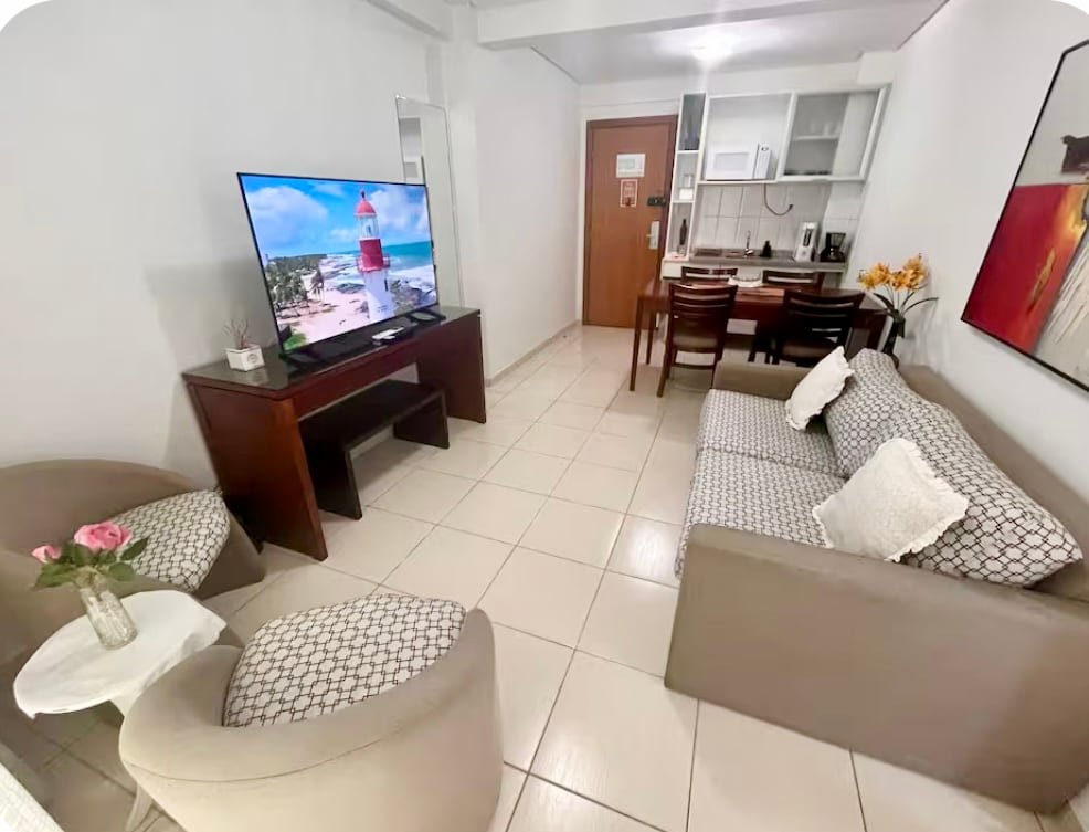 Bucură-te de un studio modern, confortabil și frumos decorat, situat chiar în fața plajei Armação. Spațiul are un pat dublu, o bucătărie complet utilată, Wi-Fi rapid și tot ce ai nevoie pentru a te simți ca acasă. Clădirea este nouă, sigură și plină de farmec – cu arhitectură contemporană, spații bine concepute și o atmosferă artistică care face o primă impresie excelentă. Ideal pentru cupluri, prieteni sau persoane care călătoresc în interes de afaceri. Vino să-l experimentezi pe Salvador cu confort și comoditate.
