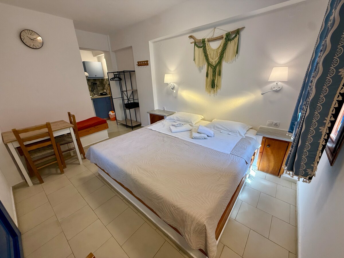 Bine ai venit la Jimmy's place - apartament studio, pe care am încercat să-l facem cât mai confortabil și primitor posibil. Bucătăria are tot ce îți trebuie, patul matrimonial are o nouă saltea hipoalergenică cu aloe vera și perne. Aerul condiționat este, desigur, disponibil gratuit. Sperăm că veți veni să ne vizitați în Samos cândva... :)