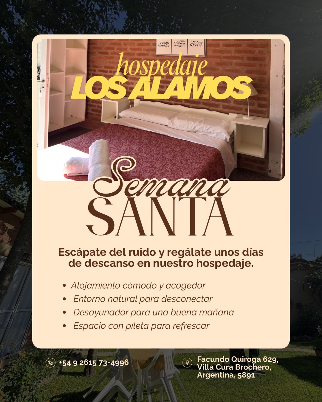 Oferim un Monoambient pentru familii și un apartament, pentru 2 persoane. Atât într-un spațiu liniștit, potrivit pentru familii, Parque arbolado cu grătar și Wi-Fi. La 6 străzi de centrul orașului Mina Clavero și înconjurat de Rios, Panaholma, Rio los Sauces și Mina Clavero , au declarat aceasta din urmă una dintre cele 7 minuni ale Argentinei. Oferim informații turistice despre zonă de către proprietarii săi. Prețul afișat este de persoană, dar în grupul de familie. Consultă tarifele pentru o singură persoană și promoții.