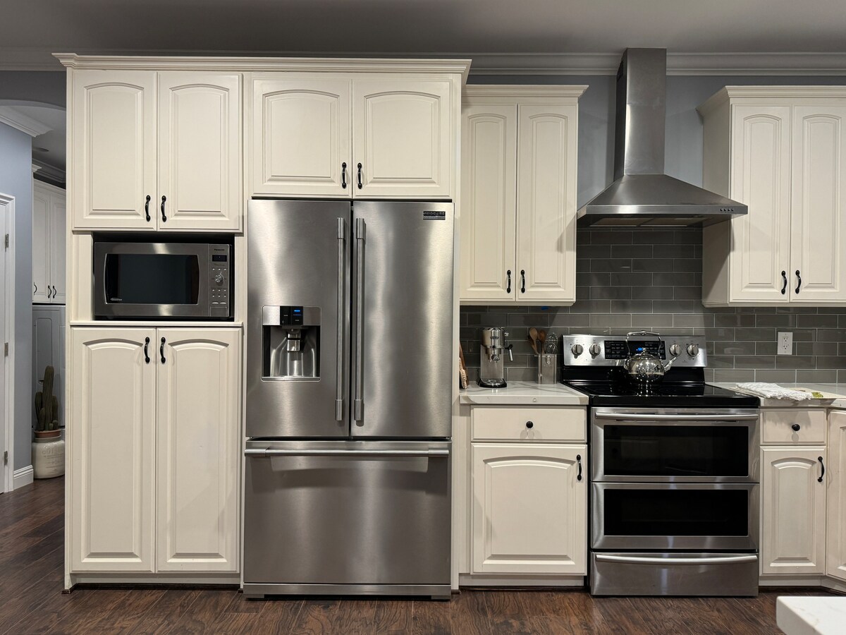 Casă superbă cu 3 paturi/2 băi, cu un singur etaj, cu PISCINĂ PRIVATĂ încălzită, care se simte ca un complex de 5 stele, cu încărcare GRATUITĂ EV pentru mașina ta. Curte frumoasă, grătar și lounge cu 12 locuri, piscină și cadă cu hidromasaj cu tobogan cu apă. Șemineu, TV OLED de 85”, spațiu de lucru, Wi-Fi de mare viteză, sală de sport. Bucătărie complet utilată, aragaz cu 6 arzătoare, aragaz cu orez, cafetieră etc. Spălătorie cu mașină de spălat/uscător, fier/masă de călcat, aer condiționat, încălzire, lenjerie de pat/prosoape, Pack & play. Încuietoare digitală a ușii, alee pentru 4 vehicule.