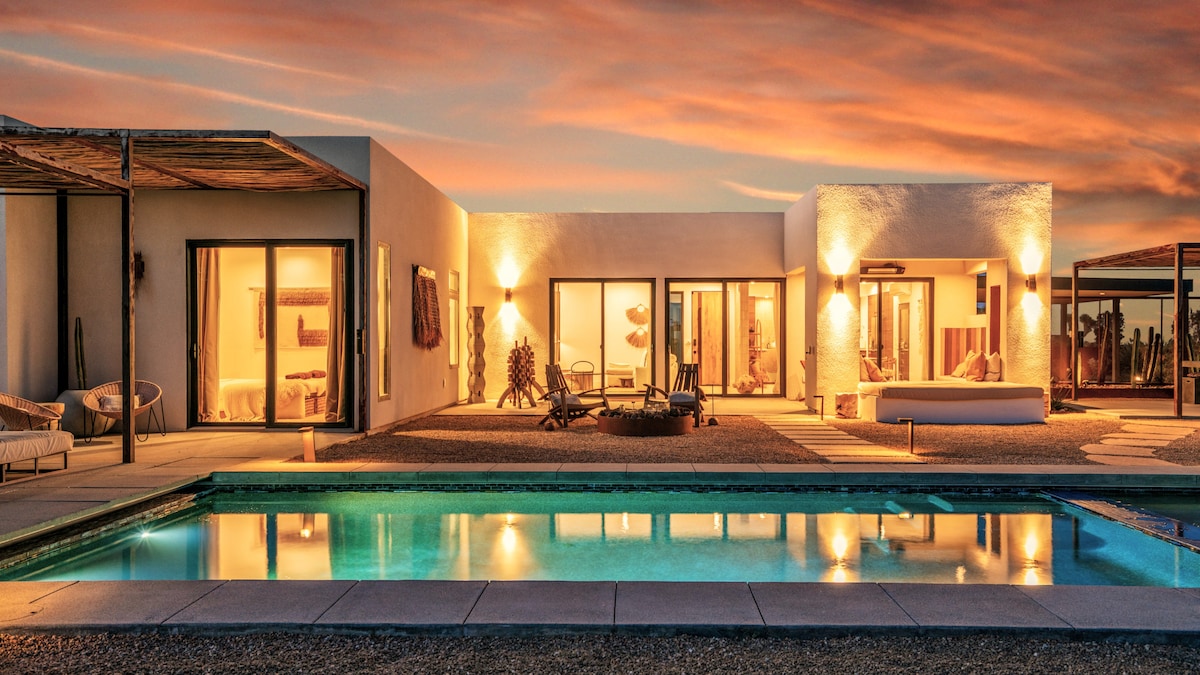 ADOR JOSHUA TREE. Creat pentru amintiri: zile la piscină, seri la spa și dimineți liniștite sub cerul larg al deșertului. Desert Owl Estate este o locuință recent renovată, amplasată pe o suprafață de aproape un hectar, care dispune de o piscină și un spa în stil de complex turistic, vedere la munte și spații interioare și exterioare atent amenajate. Indiferent dacă plănuiești o escapadă în familie, o pauză pentru creativitate sau o evadare liniștită în deșert, locuința îmbină confortul, stilul și energia calmă pentru care este cunoscut deșertul înalt – toate la doar câteva minute de Parcul Național Joshua Tree.