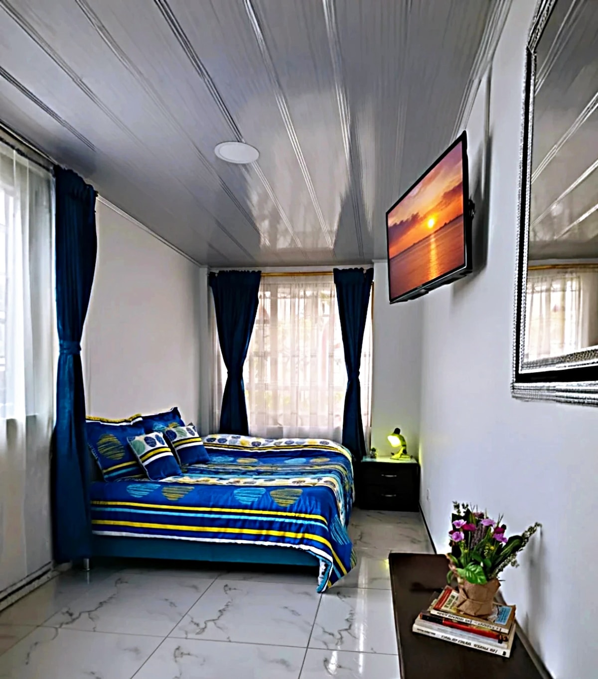 • Locație strategică: lângă Transmilenio, Centro Histórico, Estadio el Campin, Movistar Arena, Corferias, restaurante și centre comerciale •Cameră cu pat matrimonial, Smart TV cu aplicații și baie privată •Sala-Estudio cu o canapea extensibilă și o jumătate de baie •Wi-Fi Fiber Optic de mare viteză 900mb •Balconul are vedere la dealurile orientale •Complex rezidențial cu securitate non-stop • Parc privat în ansamblu, fără costuri •Bucătărie dotată cu frigider, cuptor, veselă, vase, linguri, cuțite