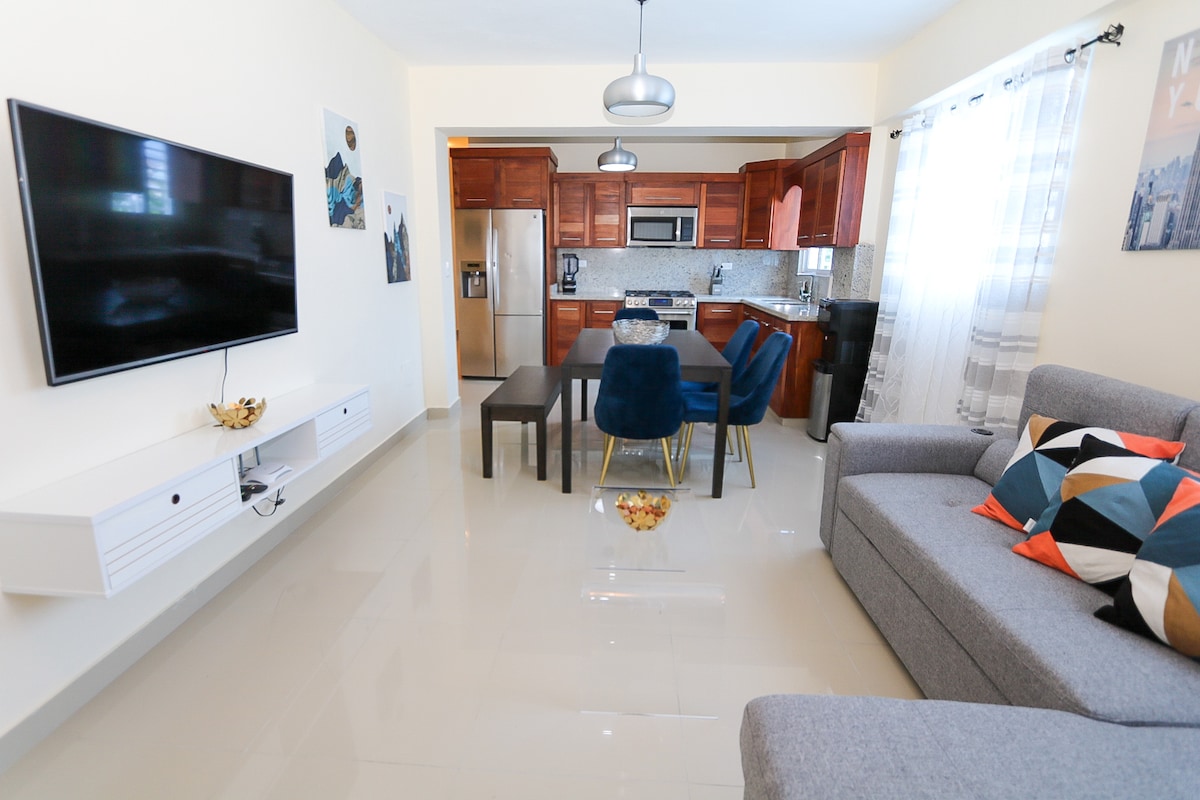 Bucură-te de experiența de a sta în apartamentul nostru confortabil și de lux din zona exclusivistă Piantini. Acest apartament cu vedere incredibilă la oraș (etajul 11) se află la câțiva pași de unele dintre cele mai bune restaurante și mall-uri din Santo Domingo. Are un televizor inteligent de 55"în living și un televizor inteligent de 50" în dormitor, cu Netflix și Disney Plus. Acesta prezintă, de asemenea, o rețea Wi-Fi de mare viteză (100 Mbps) și dotări de bucătărie. Acest apartament confortabil este perfect pentru turiștii care vizitează orașul sau călătorii de afaceri.
