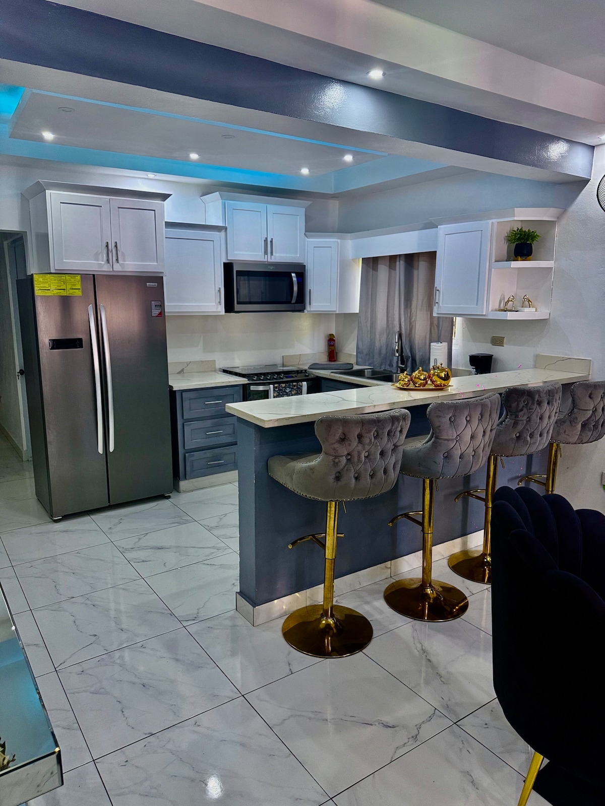 Bucură-te de acest penthouse modern, complet utilat, situat într-o zonă sigură, centrală, la doar 5 minute de Playa Los Almendros și de centrul orașului Peravia (Baní). Apartamentul are 3 dormitoare, 4 băi, aer condiționat, dulapuri spațioase, parcare pentru 2 vehicule și dotări, inclusiv o sală de gimnastică, zonă de joacă pentru copii și spațiu pentru evenimente la etajul 5. Masa de biliard este numai pentru adulți. Servicii opționale: închiriere de vehicule și transferuri de la aeroport. Fără lift.