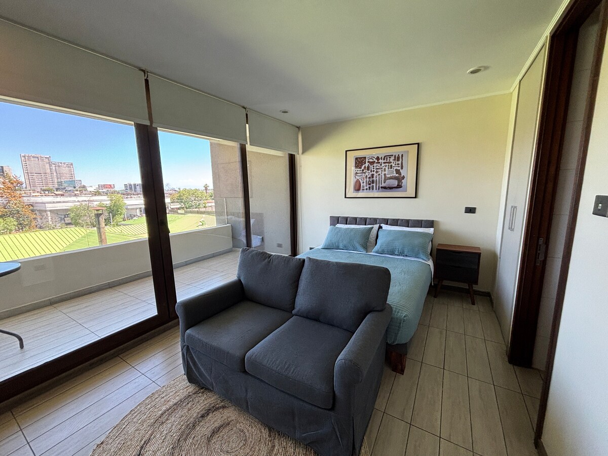 Bucură-te, relaxează-te și cunoaște Santiago Apartament nou, complet echipat, situat strategic, deoarece, pe lângă metroul Escuela Agrícola și la câțiva pași de universități, restaurante și la doar câteva minute de centrele de sănătate, mall, stadionul național etc. Are 1 dormitor și 1 baie, picina, sală de gimnastică, quincho, spălătorie, zonă de recreere pentru copii, zone verzi, parcare pentru vizite și securitate 24/7; ideal pentru familie, cupluri, prieteni și aventuroasă.
