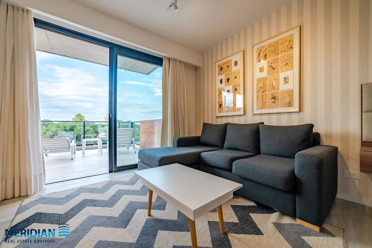 Beautiful 1 bedroom apartment, fully equipped for long-term stays. It is located on the fourth floor of a modern fourth-class building, Tribeca San Blas. Located in a very safe, residential area neighborhood, Manorá, walking distance from the main shopping centers, Shopping del Sol, Paseo la Galería, WTC Asunción, and Paseo Carmelitas.