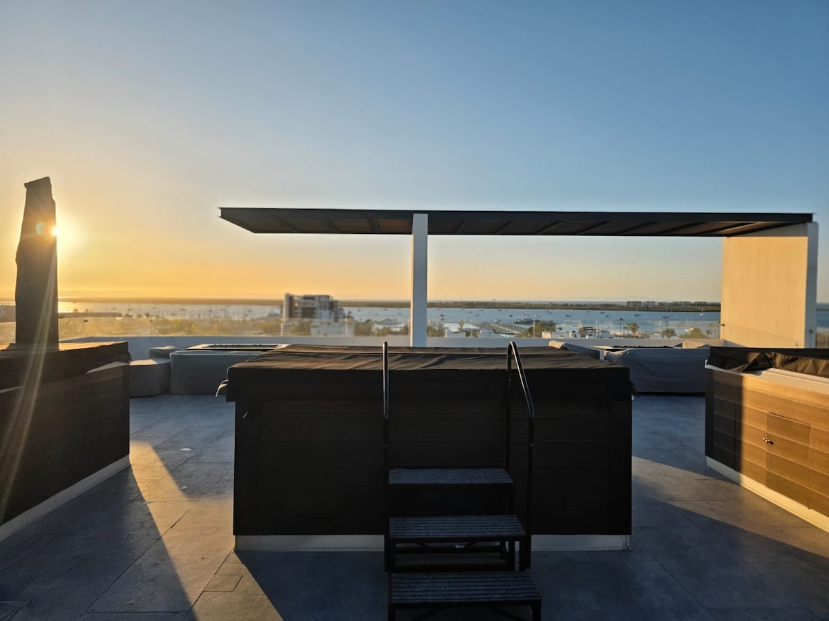 ✨ Acoperiș cu cadă la 1 stradă de mare Bucură-te de apusuri de soare uimitoare din jacuzzi-ul privat de pe acoperiș. Acest apartament modern este perfect pentru o evadare romantică sau o pauză relaxantă. Situat într-o zonă liniștită, la doar o stradă de mare și înconjurat de palmieri și briza mării. 🛏 1 cameră confortabilă 🛁 2 băi complete 👙 Acoperiș privat cu cadă ☕ Bucătărie utilată + aer condiționat 🌐 Wi-Fi și parcare incluse Relaxează-te, deconectează-te!