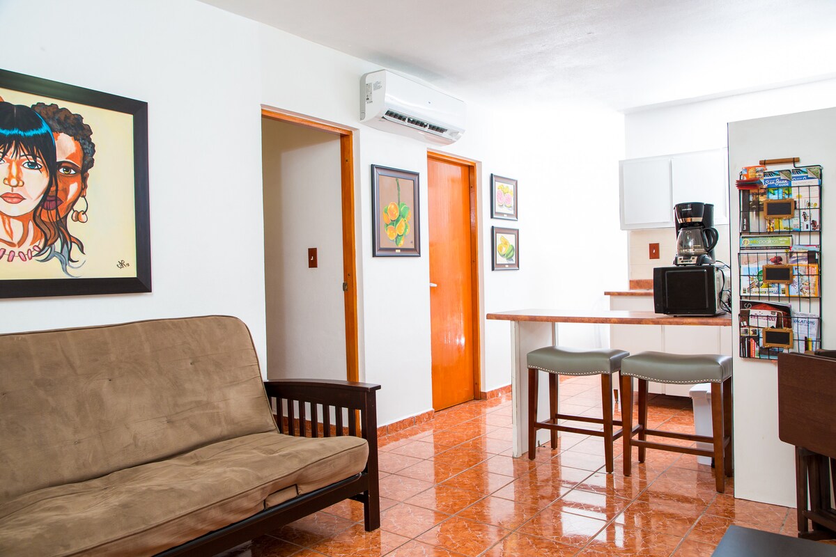 This large, spacious guest apartment is perfect for your group of 4 who want to enjoy the beach, bars, coffeeshops and restaurants of San Juan. Located in one of San Juan's most desirable neighborhoods, Miramar, you will be on a quiet street, only a few blocks away from the trendy Calle Cerra area. The area is known for it's large graffiti murals, trendy restaurants and bars, and relaxed party vibes. During the day, enjoy the many nearby beaches - only 5 minute drive or 15 minutes walking!