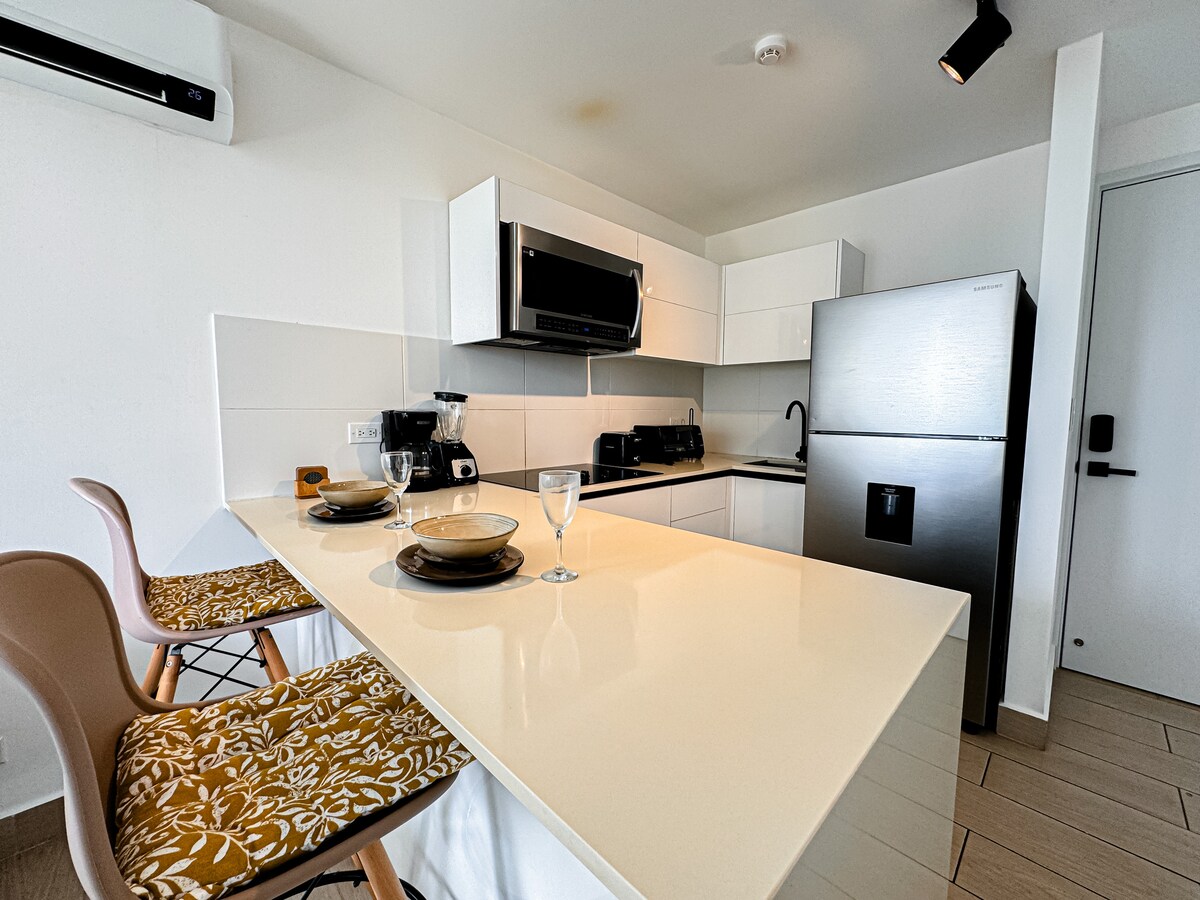 Welcome to your modern, stylish apartment in the heart of Panama City just minutes from Casco Viejo. 🏡 The Space • Entire Unit With AC • Open, light-filled living area • Fully equipped kitchen • Modern bathroom with subway-tile shower • In-unit washer & dryer • Smart TV • Dedicated workspace 📍 Great Location You’ll be close to Casco Viejo’s historic streets, rooftop bars, and restaurants, plus the Cinta Costera, cafés, grocery stores, pharmacies, and public transportation.