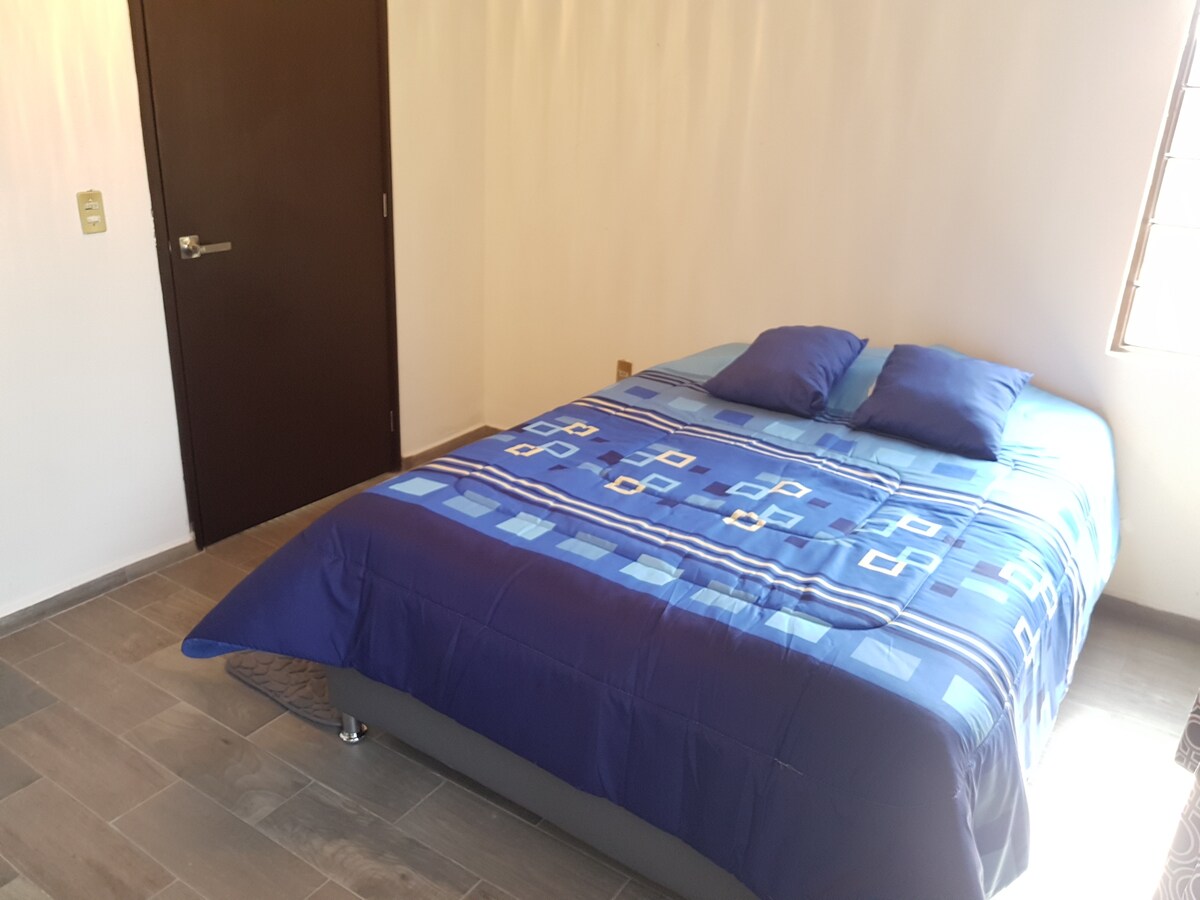 Apartament modern, complet independent, situat la doar 7 minute de Aeroportul Internațional Toluca și aproape de zona industrială. Perfect pentru călători, odihnă sau șederi în interes de serviciu. Are două dormitoare cu paturi duble și dulapuri, o baie completă, un living cu TV, un birou perfect pentru lucru, o sufragerie și o bucătărie complet utilată cu frigider, cuptor cu microunde, blender și cafetieră. Garaj pentru un vehicul. Totul este gata să te facă să te simți ca acasă!