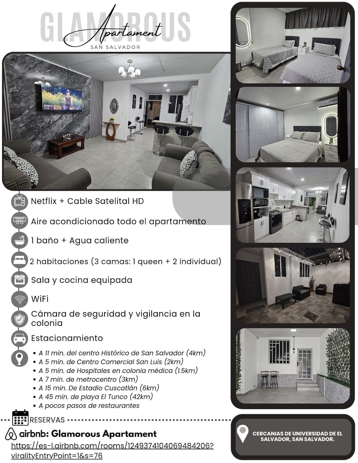 Disfruta de una experiencia con estilo en San Salvador con este alojamiento céntrico. Al realizar tu reserva, obtienes acceso inmediato a supermercados, restaurantes, el Centro Histórico, centros comerciales y hospitales. Con capacidad de hasta 4 huéspedes. Ofrecemos 2 habitaciones con un total de 3 camas (2 individuales y 1 queen), las habitaciones y sala poseen A/C; la cocina esta totalmente equipada. Contamos con parqueo gratuito, seguridad las 24H y cámara de seguridad. Internet 100MB.