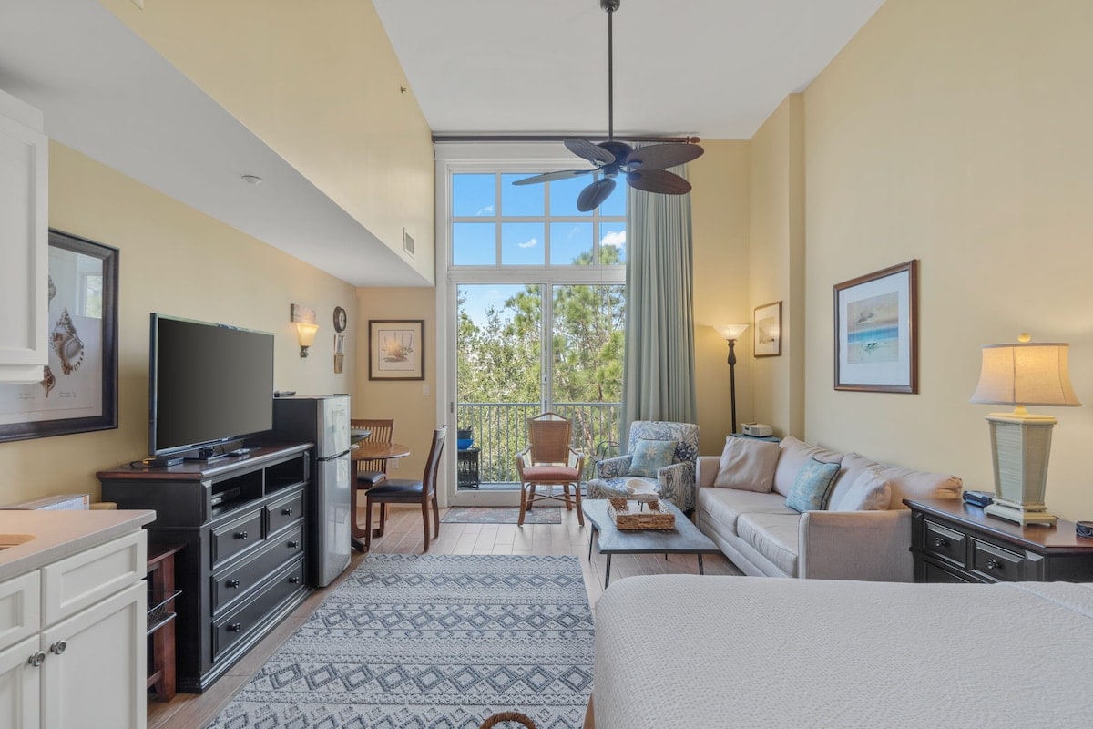 8th fl. stylish open studio w/stunning VIEW, beachfront in Sandestin Resort between Destin & 30A. 🛺 Golf cart with 5+ nts. NEW Pool & Hot Tub. West Elm furniture & King size bed w/ocean view. Sleek Kitchen w/dishwasher & Keurig. WiFi, 55” smart TV. Washer/dryer. Huge balcony to gaze @ the sea. Enjoy the beach, dining, shopping, trails, golf & entertainment all without leaving the resort. Tram pass & Gym. Perfect for honeymoon, baby moon, girls trip, solo travel or lil family vacay *NO animals