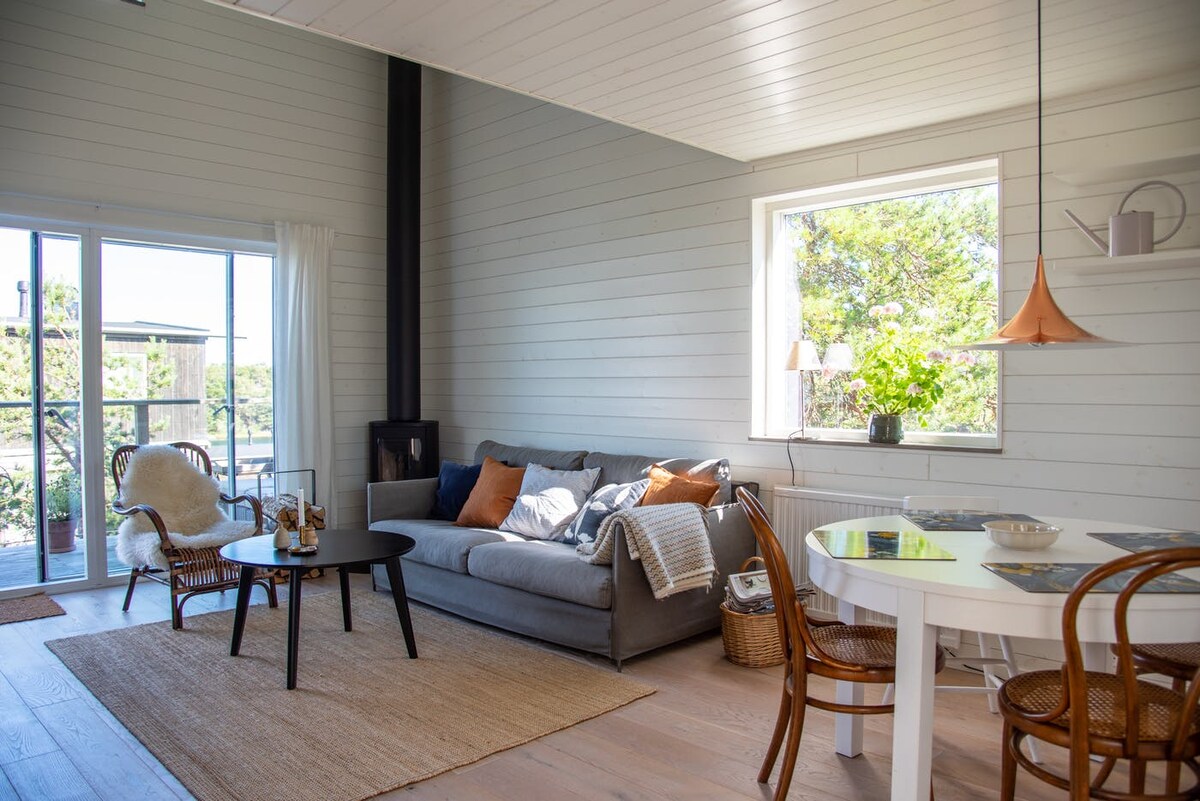 Cabană nou construită de 30 mp. 5 minute de mers pe jos de port. - Plan deschis, cu bucătărie și living într-una. - Mansardă de dormit cu 2 paturi single. - Livingul are o canapea extensibilă. - Bucătăria are plită cu inducție și cuptor. - Baie complet cu gresie, cu toaletă, duș și mașină de spălat rufe. - Terasă mare în jurul casei cu zonă de luat masa. - Priveliștea este formată din pădure de pini și afine - Curățenia nu este inclusă. - Animalele de companie nu sunt acceptate - Oaspeții își aduc propriile lenjerie de pat și prosoape (pot fi închiriate pentru 150 SEK de persoană)