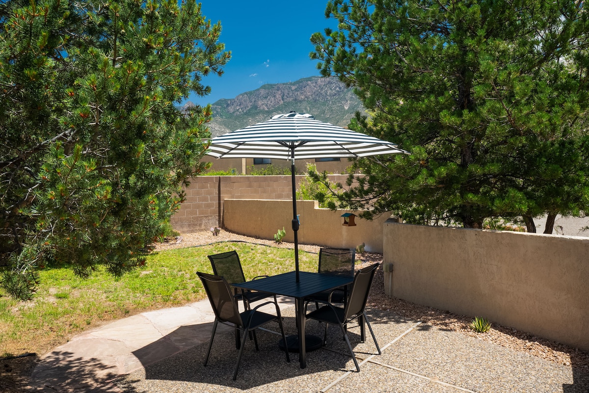 Welcome to your peaceful safe retreat in the best foothill neighborhood—just 7 min from I-40, 12 from I-25. Tucked away on a quiet cul-de-sac, this cozy in-law suite was created for loved ones. Enjoy your private entry, your own patio with outdoor dining and seating, and off-street parking. Feel at home as you relax in the serene 2/3-acre garden with a tranquil pond, tea hut, and deer visitors. Trails and grocery are a short walk away. Sip organic coffee, rest in all-white linens, and simply be.