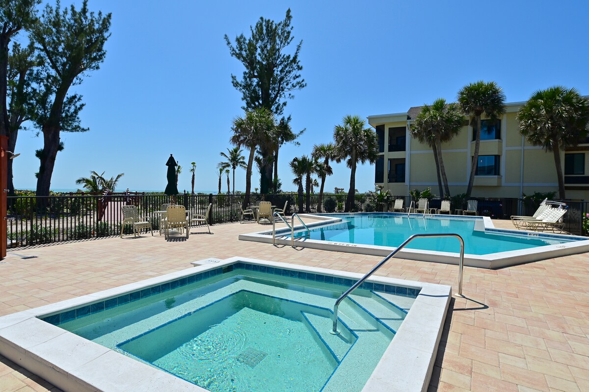 We are a Superhost for a reason! Sanibel Siesta looks amazing! Immaculate beachfront, 2BR, 2BA w/garage, nicely updated beachy unit at sand's edge. Cooks kitchen. Amazing views of the Gulf w/5 star ratings! 3-day min. New hurricane windows, nicely furnished with ELEVATOR IN BUILDING! Discount for weekly/mo. rentals. BR 1:King bed ensuite, smart TV. BR 2: 2 tw. beds, smart TV. Qn. sofa bed in LR. Pool, golf course, bikes, laundry on site. No food or condiments stored in unit. May allow sm. dog.