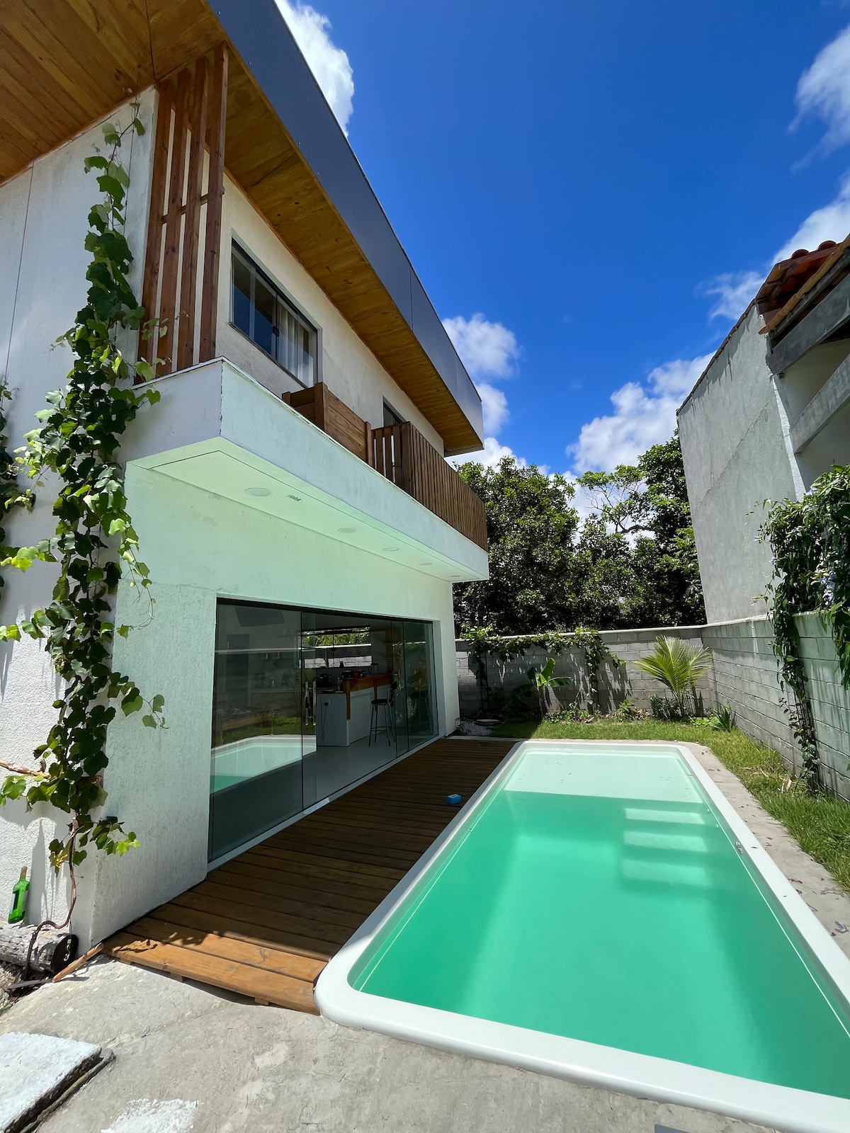 🏡 Casa de Pedra – Charme, Conforto e Vista para o Mar A Casa de Pedra é o refúgio ideal para quem busca charme rústico moderno, conforto e uma vista espetacular do mar 🌅 Com piscina privativa, jardim, alpendre e área gourmet com churrasqueira, é perfeita para relaxar com família, amigos ou a dois 💛Todos os quartos são climatizados, garantindo conforto e privacidade. Localizada em condomínio fechado, a apenas 800 m da Praia de Taperapuã e comércio local 🏖️ 🌿 Pet friendly com personalidade!🏖
