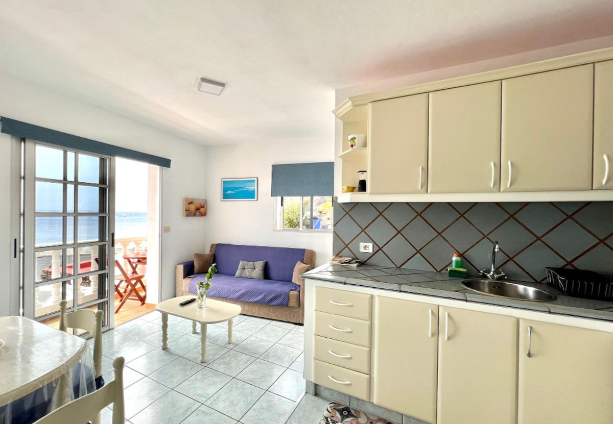 Apartament modern recent renovat, cu vedere la ocean. Se compune dintr-un dormitor cu pat dublu și un living cu o canapea extensibilă, un televizor mare cu ecran plat și o chicinetă. Toate apartamentele au terase magnifice cu vedere la mare, mobilier de luat masa. Bucătăria are toate facilitățile necesare, cum ar fi plită cu inducție, cuptor/cuptor cu microunde, prăjitor de pâine, frigider și mașină de spălat vase și ustensile de bucătărie. Baia are duș și WC, prosoape și uscător de păr.