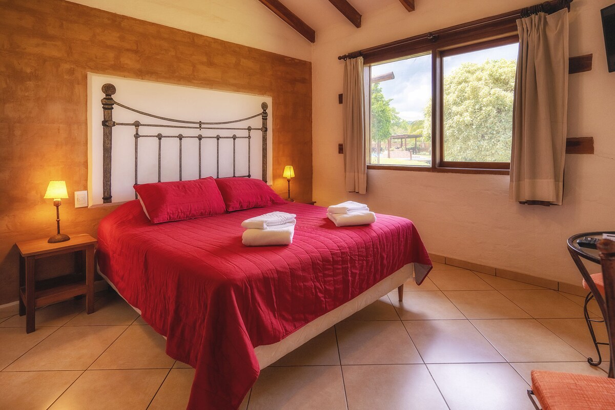 Cameră dublă cu categorie clasică. Este situată la parter, cu vedere la grădina principală și acces din curtea interioară. Aceasta este camera Ametauná, decorată cu motive Chiquitano; cea mai ieftină, cu toate serviciile și dotările. - Aer condiționat -TV -WIFI -Frigider - Produse de igienă - Curățare zilnică - Micul dejun a inclus Villa Chiquitana este un mediu spațios de relaxare și confort pentru a experimenta esența Chiquitaniei.