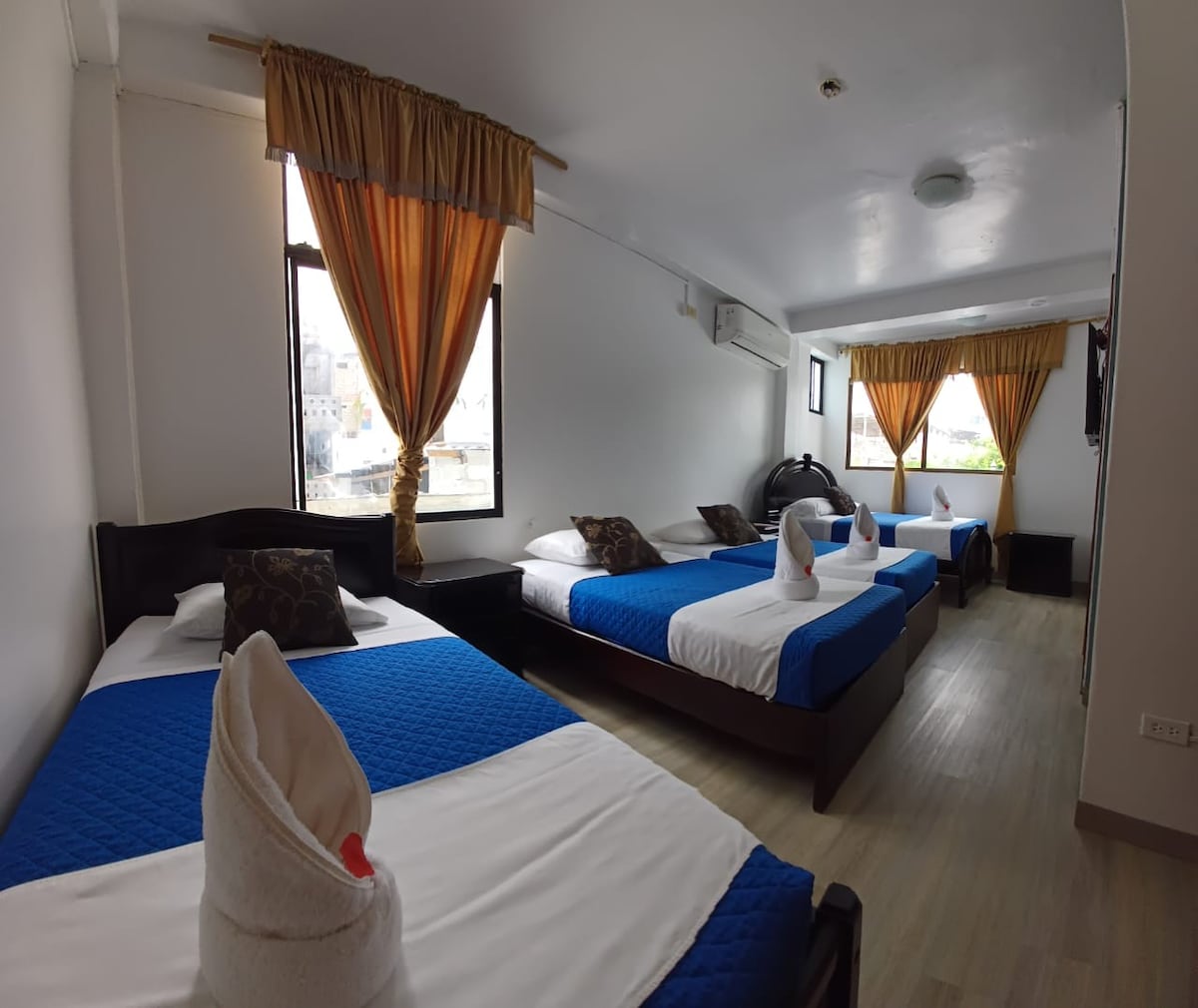 Habitación en segunda planta. La habitación cuenta con 2 camas Queen, aire acondicionado, baño privado con agua caliente y secador de cabello. Disfruta de nuestra piscina luego de tus actividades turísticas. Te brindamos agua filtrada, te y café Galapagueño free 24 horas, disponible cundo lo necesites. Nuestras tarifas no incluyen 15% IVA, por favor si eres de ECUADOR y requieres Factura comunícate con nosotros antes de confirmar tu reserva.
