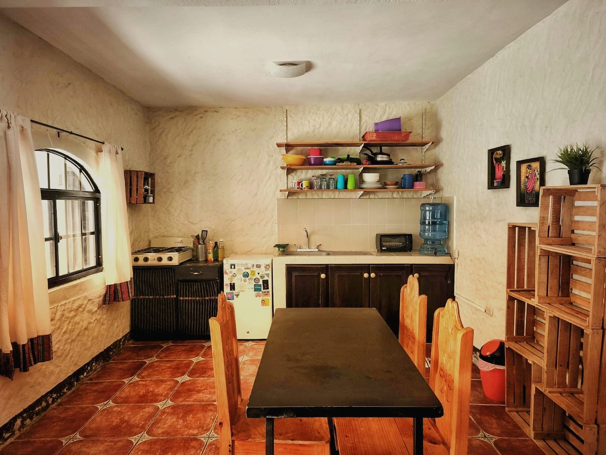 Ascuns în cea mai liniștită parte a orașului San Marcos, vei găsi cele mai bune priveliști ale lacului și vulcanului din jur. Bucură-te de ultimul etaj al unei case frumoase în stil colonial cu 3 etaje, cu 2 dormitoare spațioase, un living mare, confortabil, cu canapea și șemineu, o bucătărie complet aprovizionată și o grădină luxuriantă. La 7 minute de mers pe jos de centru - bucură-te de toate beneficiile de a trăi în San Marcos fără potențialele nopți haotice în apropiere de centrul orașului. Adormi în fața insectelor care ciripesc și te trezești la păsările care cântă.