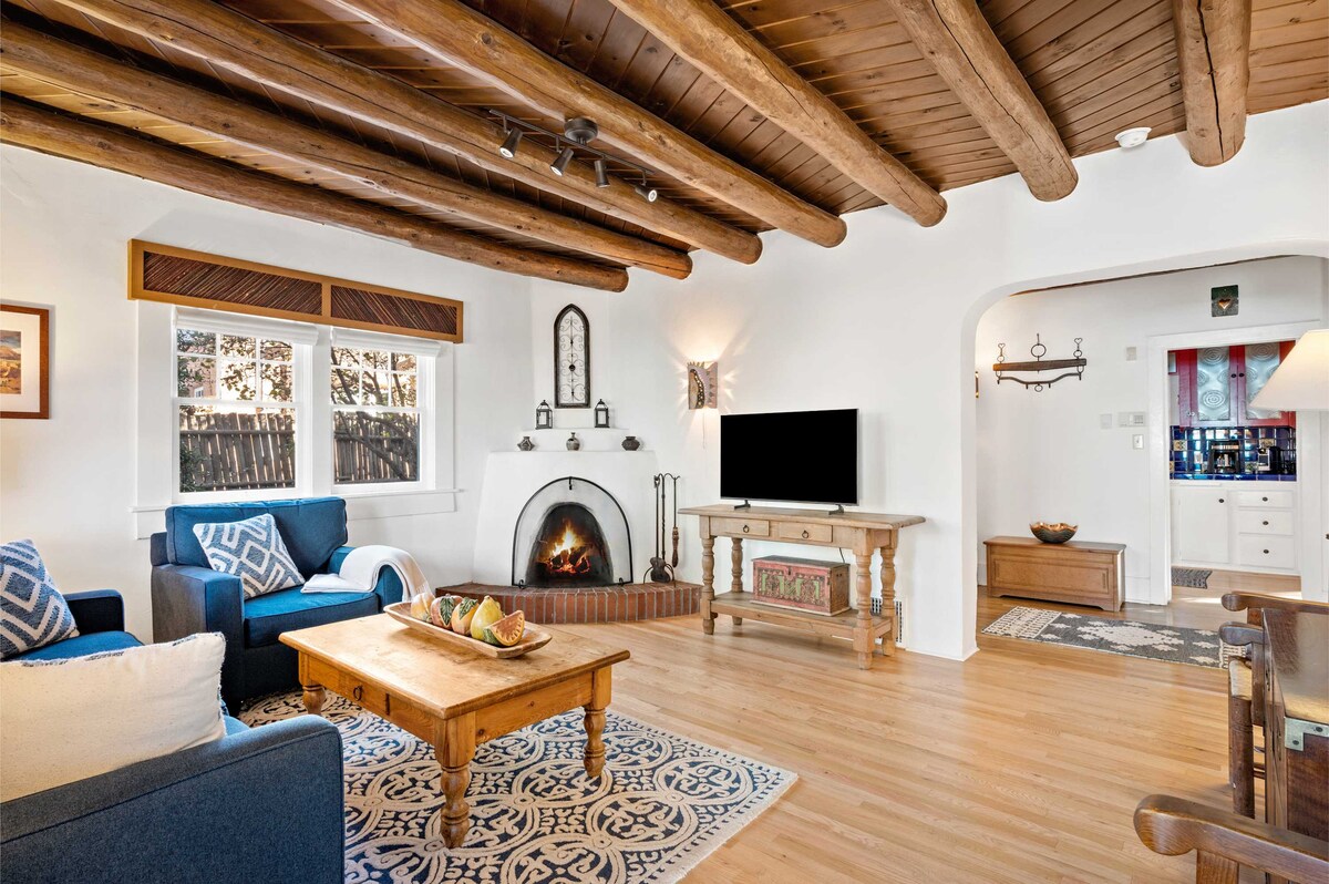 Soooo romantic! This nostalgic 1 BR/1 bath historic home is privately tucked away behind adobe walls on a quiet street just steps from downtown. Loaded with Santa Fe charm: viga ceilings, a seasonal kiva fireplace, full kitchen & beautiful private patio with a waterfall and koi pond. Walk to the Railyard, Plaza and gallery-filled Canyon Road. Pro-speed wifi and off-street parking keep your stay stress-free. Close to everything, while still quiet & private. Magic!
