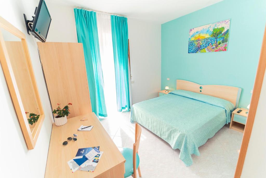 Cameră dublă cu balcon cu vedere la mare, luminoasă și confortabilă, dotată cu baie privată, WiFi, TV și aer condiționat. În fiecare dimineață te vom întâmpina cu un mic dejun autentic și bine întreținut, servit pe terasă cu priveliște, pentru a începe ziua în cel mai bun mod. La câteva minute de hotel, vei găsi frumoasele noastre plaje cu steag albastru, caracterizate de adâncimi puțin adânci și ape cristaline.