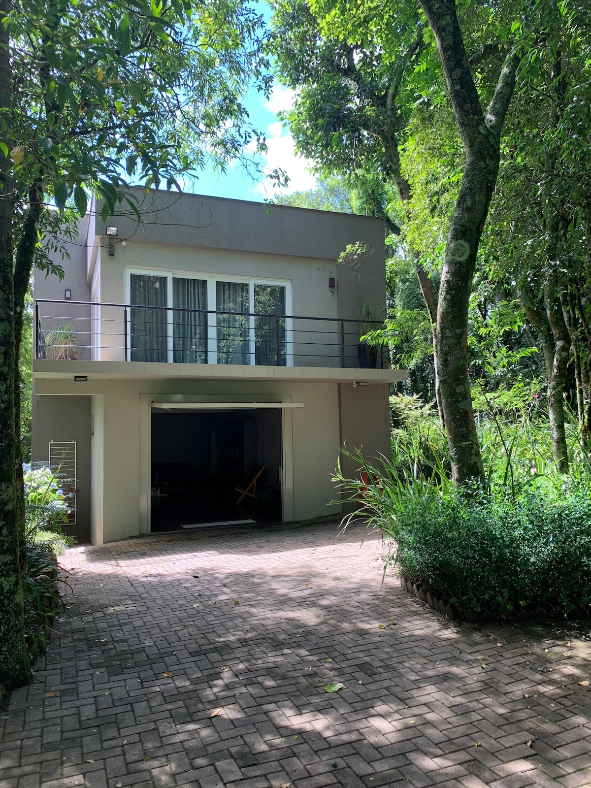 Casa em Gramado muito aconchegante em local tranquilo e arborizado. Do quarto e do terraço enxerga-se o lago em frente. Na sala de estar toda de vidro, equipada com churrasqueira, lareira e forno a lenha, fica de fundos para o pátio todo verde e arborizado.