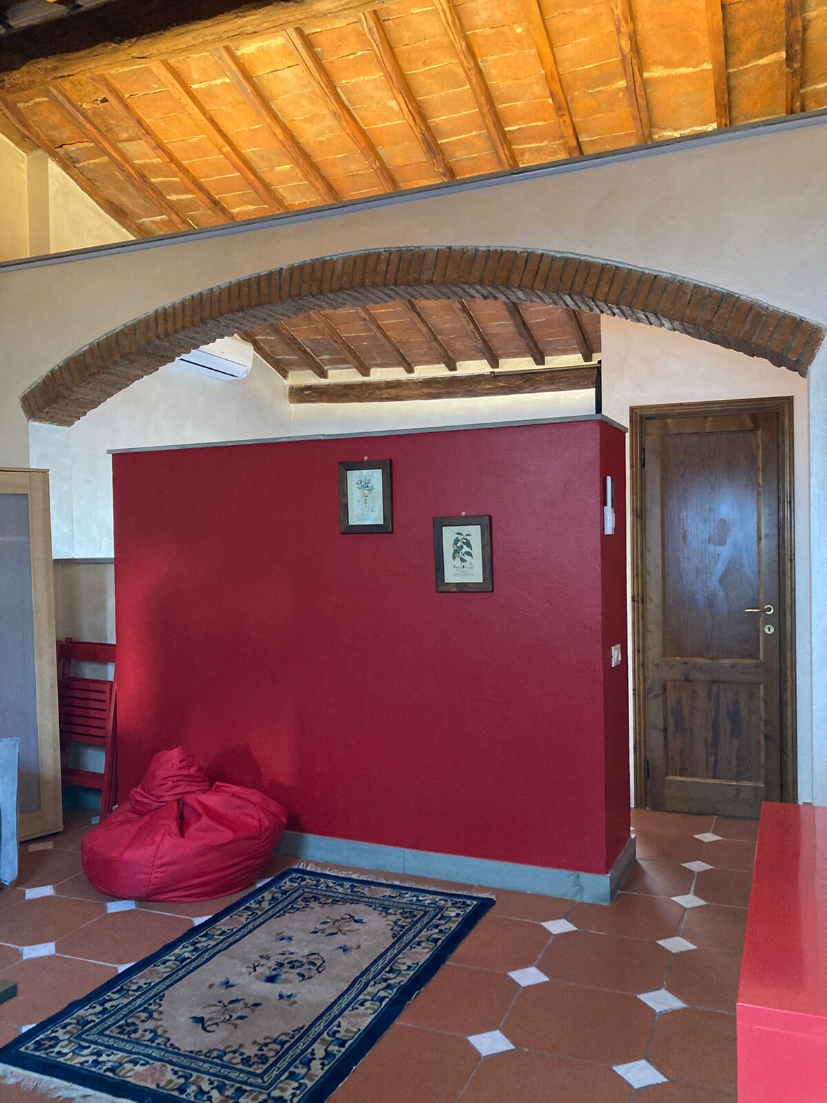 Fermă toscană de 140 de metri pătrați cu două dormitoare de până la patru persoane, living foarte mare cu șemineu cu podele din teracotă și tavane tipice, bucătărie echipată pentru gătit cu frigider și cuptor cu microunde, curte exterioară din piatră antică cu masă și scaune și grădină privată cu măslini. Clienții sunt rugați să vină cu mașina. Dacă doriți, încălzirea este plătită și în funcție de consum și poate fi pornită numai din perioada stabilită de regiune.