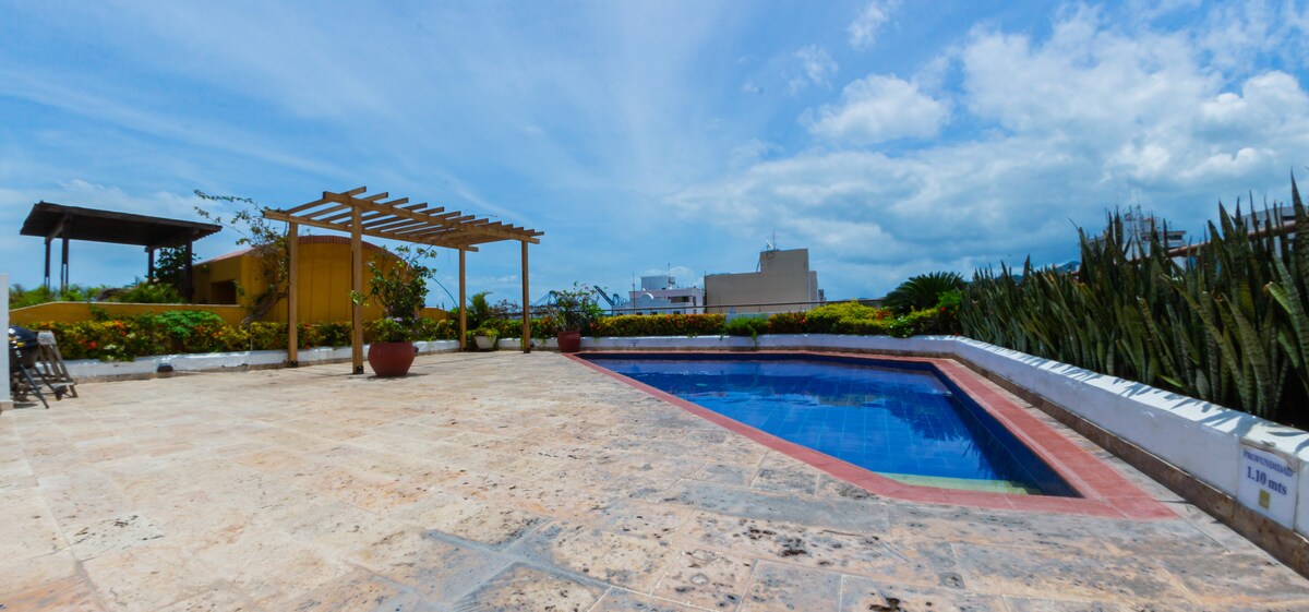 Îndreaptă-te spre acoperiș, unde te poți relaxa în două piscine! Apartamentul este la câțiva pași (în jur de 5 minute) de zona golfului, de plajă și de cea mai bună gastronomie și cultură pe care orașul o oferă. Nu ezita să ne contactezi pentru recomandări! Poziția centrală a apartamentului este perfectă pentru a vizita plajele locale, precum și cele mai renumite atracții din apropiere: Tayrona Park, Palomino, Minca și Lost City (pentru a numi câteva!).