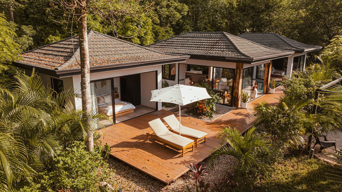 Casa Khoisan is a stylish custom designed casita nestled in the jungle and overlooking the Pacific Ocean. Enjoy the cooler hilltop temps up on the wide floating terrace immersed in nature surrounded by abundant wildlife, while being a quick 5 minute drive to the gorgeous white sand surfing beach and village of Playa Hermosa in North Santa Teresa. The villa offers a full kitchen, spacious open air garden bathroom, outside shower with surf racks, A/C, high speed internet, and secured parking