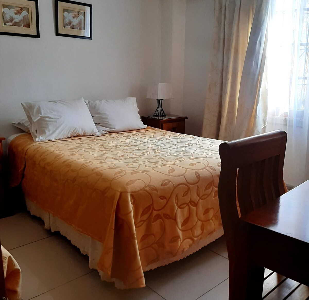 Amplia habitación matrimonial con baño privado. La habitación queda en el Hotel Nogales, Ubicado en providencia cerca del metro los Leones, costanera center y en un barrio tranquilo y residencial. Se puede agregar desayuno estilo buffet por 12.000 pesos.