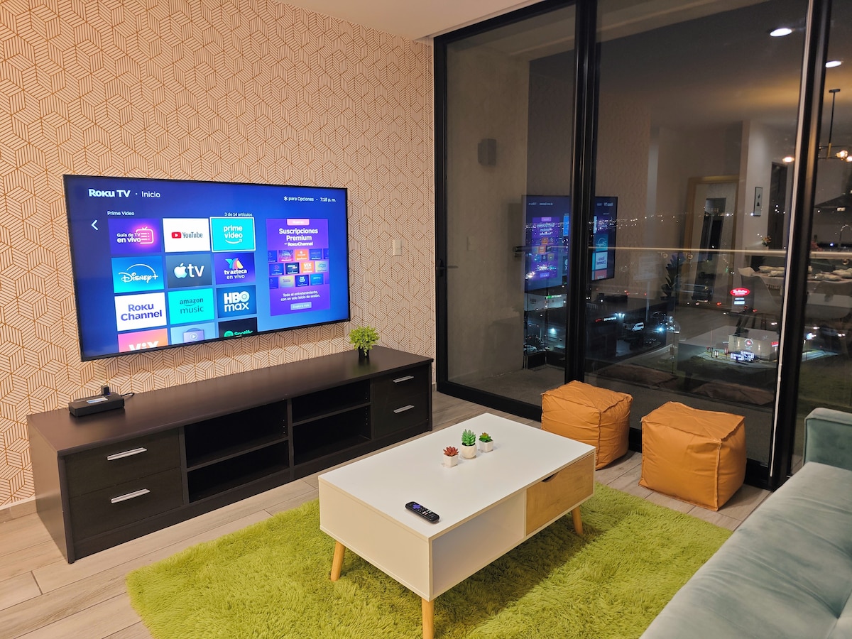 Nou-nouț, situat în inima orașului Juriquilla, acest apartament de 160 m2 oferă o experiență unică, depășind așteptările cu dotări și divertisment. Dacă ești în căutarea unei calități superioare, nu mai căuta și vino în cel mai modern și luxos apartament din Queretaro pentru o ședere de neuitat La câțiva pași de Starbucks, Walmart, baruri și restaurante de top, cum ar fi Sonora Grill & Hunger, acest apartament are totul, paturi confortabile, balcon, televizoare OLED 4K și un home cinema de 100" din patul tău