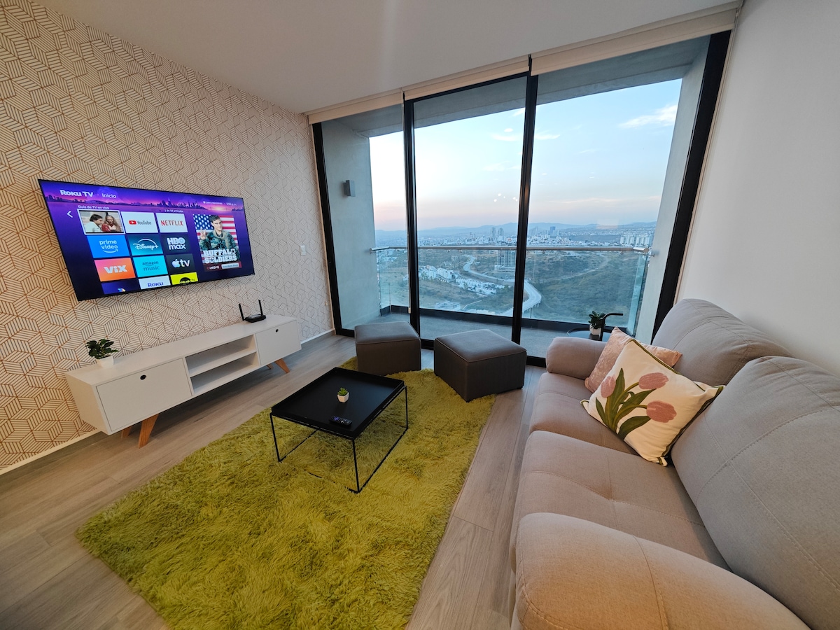 Bello y Seguro Departamento con vista hacia los Arcos de Querétaro. Perfecto para largas estancias, por su equipamiento 100% pensado en largas estancias así como sus más de 10 Amenidades de Lujo. Entre su equipamiento incluye: Escritorio para hacer HOME OFFICE Cocina 100% equipada Ingredientes de cocina Televisión en sala de 65" , Televisión en habitación de 55" Aire Acondicionado de 2 TONS frio/calor y muchas mas cosas que te harán amar este lugar por semanas. 1 cajón de estacionamiento