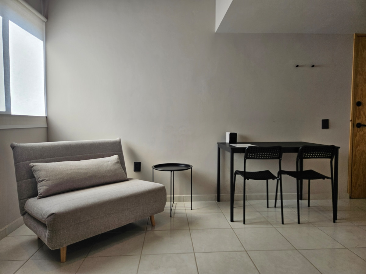 Discover a sanctuary of calm and modern art. Pintura is a high-ceiling studio where an abstract art piece and a "naked adobe wall" tell the house's storied history. An ideal space for deep rest or productivity, featuring a layout designed with accessibility in mind (ground floor, street level). Enjoy its spacious bathroom and peaceful atmosphere illuminated by three warm lighting settings. Privacy, design, and rest in the heart of Queretaro—you’re going to love this space!