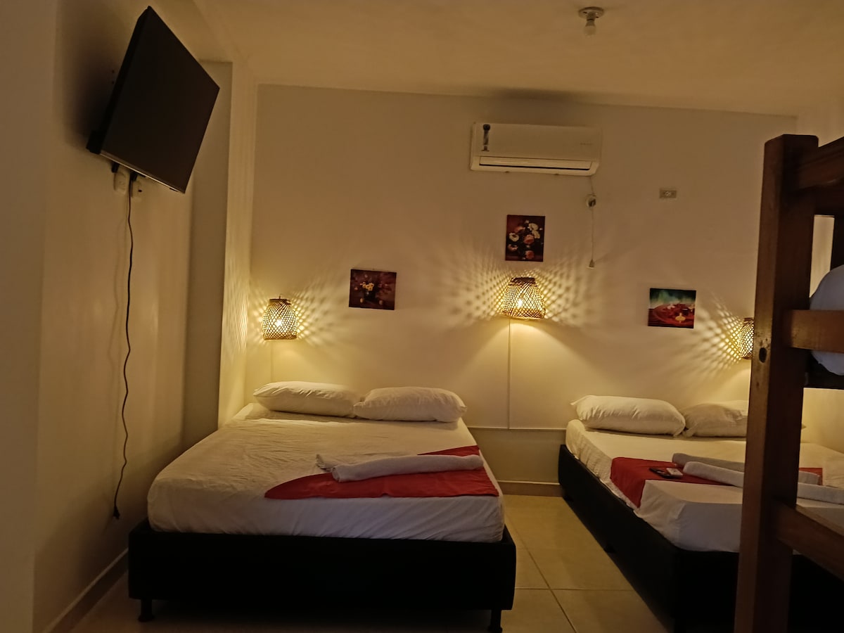 Bucurați-vă de o cameră spațioasă și confortabilă la Hotelul Hermoso Caribe, la câțiva pași de plaja din Tolú. Un spațiu modern, privat și cu aer condiționat, ideal pentru cupluri sau familii care caută odihnă, o poziție bună și o atmosferă caraibiană. Relaxează-te cu briza mării și bucură-te de liniștea lui Tolú într-un spațiu conceput pentru odihna ta.