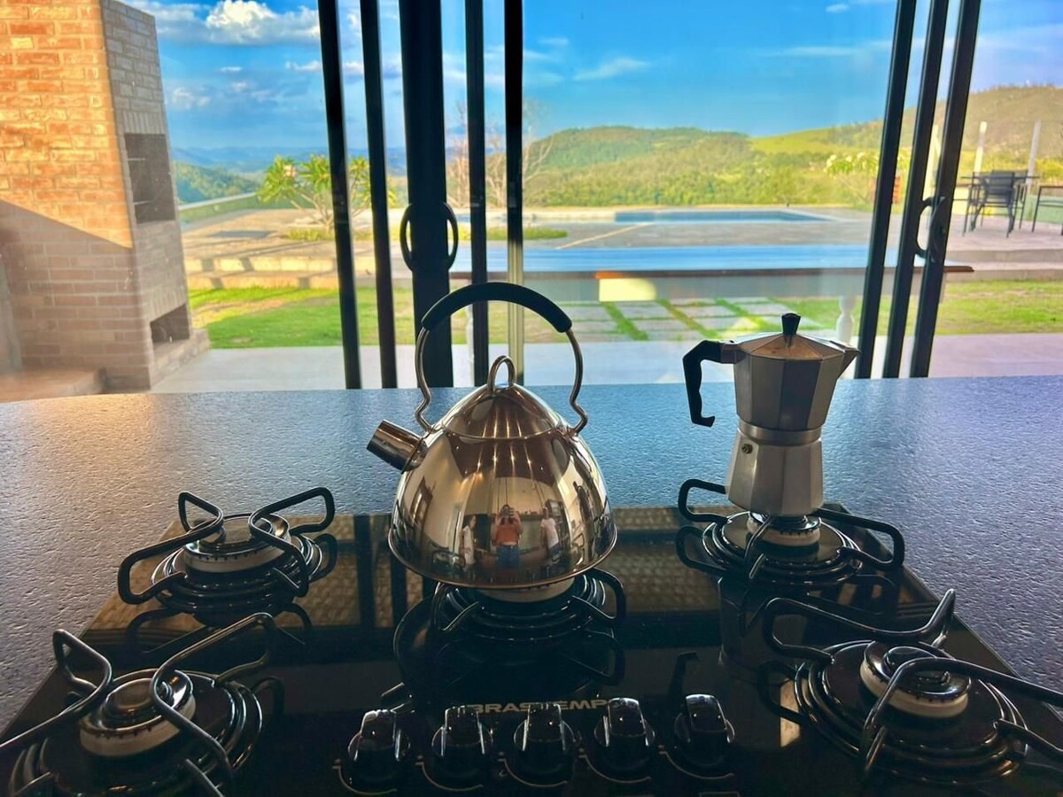 Loft envidraçado com estilo surpreendente e único em meio a cafezais e muita natureza da Serra da Mantiqueira, com direito a cachoeira privativa. SPA com hidromassagem e cromoterapia e vista panorâmica, telão de 100", cortinas automatizadas por comando de voz. Cozinha com ilha Gourmet, totalmente equipada. Forno de Pizza a lenha e churrasqueira. Quadra de areia para vôlei/beach-tennis. Cama e sofá italianos. Sauna seca panorâmica. Celebre o amor registrando seus momentos inesquecíveis.