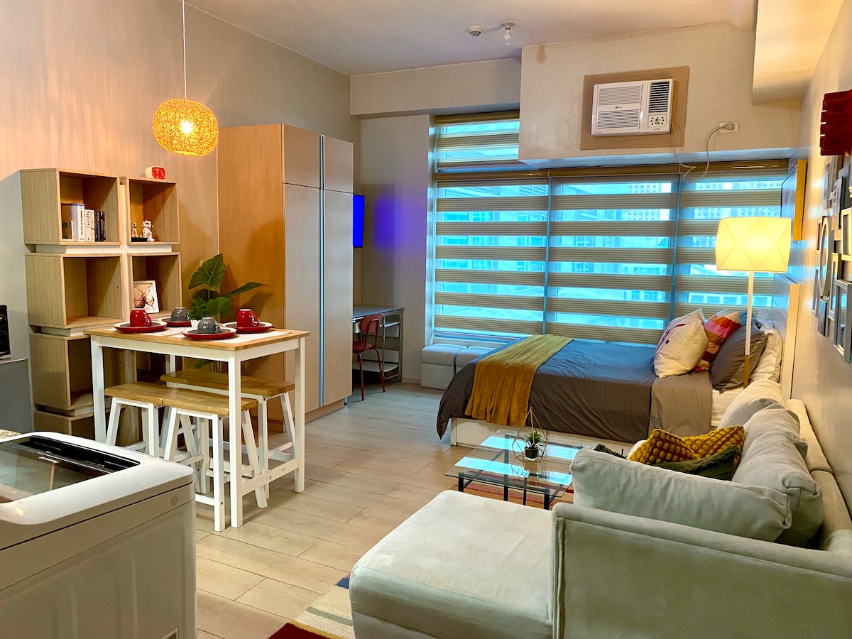 Feel stylish and experience the BGC vibe at this centrally-located place. Get direct access to Uptown Mall. This place is also just across the newly opened Mitsukoshi Mall. Our newly renovated place is bright and airy with a fantastic view of the Uptown Mall fountain show. Take an easy stroll as all major points of interests are just a few mins walk. Feel the energy of Uptown BGC. Shop, dine, or just have a relaxing break at the corner cafe. Come feel the energy of this vibrant community!