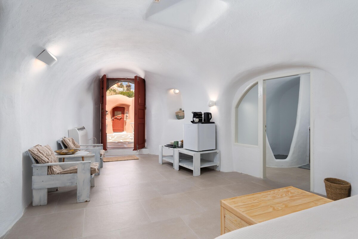 Această suită elegantă este cocoțată pe stâncile caldeirei din Oia. Combină arhitectura cicladică tradițională cu un stil decorativ minimalist, ceea ce o face alegerea perfectă pentru cei care doresc să se relaxeze. Apartamentul are aproximativ 37 mp, are o cadă cu hidromasaj privată în aer liber, oferind intimitate, împreună cu vederi uimitoare la caldeiră și vulcan. Micul dejun este inclus în preț. Camera este dotată cu aer condiționat, Wi-Fi gratuit, facilități pentru prepararea cafelei și ceaiului, facilități pentru baie și un televizor inteligent.