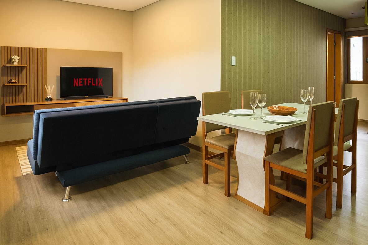 Experimentează farmecul Gramado în inima orașului! Studioul nostru modern de 40 m², de pe Bulevardul Vita, a fost conceput pentru a oferi confort, caracter practic și ospitalitate. 500 de metri de Rua Coberta Kit DE bun venit Găzduiește 4 adulți și 1 bebeluș: 1 pat queen • 1 pat de o persoană • 1 canapea extensibilă dublă • 1 pătuț Ideal pentru cupluri și familii care caută bunăstare și o locație excelentă. Ne vom asigura că rămâi!