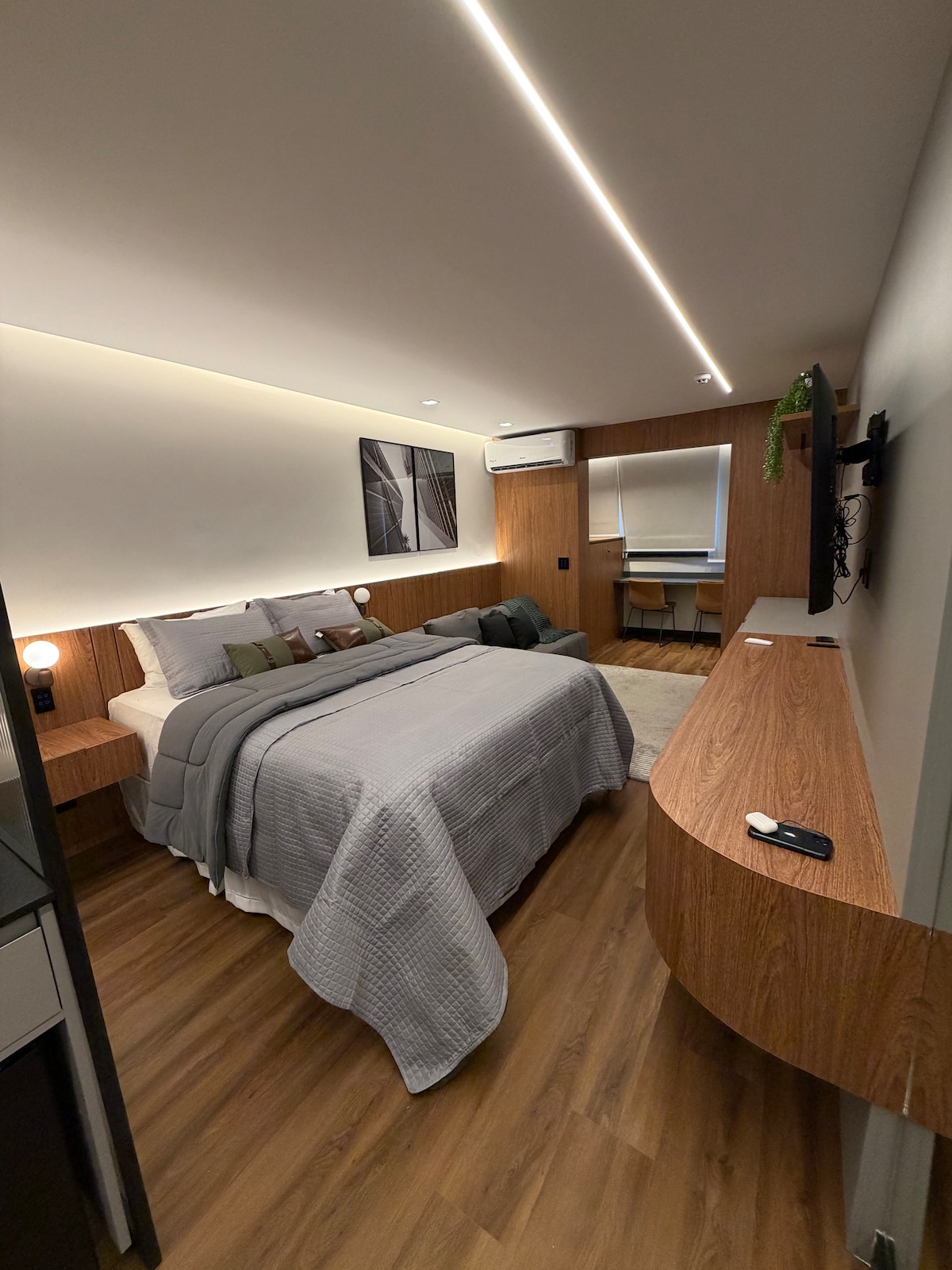 Studio industrial de 35 m² la etajul 39, cu vedere panoramică la Valea Anhangabaú. Mediu modern cu beton, cărămizi la vedere, lemn, metal și pictură murală exclusivă de Caio Fonseca, care aduce identitate și autenticitate mediului. Aproape de baruri, restaurante, traseul gastronomic al Republicii și comerț popular și teatre/muzee/centre culturale. Ideal pentru cupluri, fotografi și nomazi digitali care caută confort și stil în centrul orașului São Paulo.