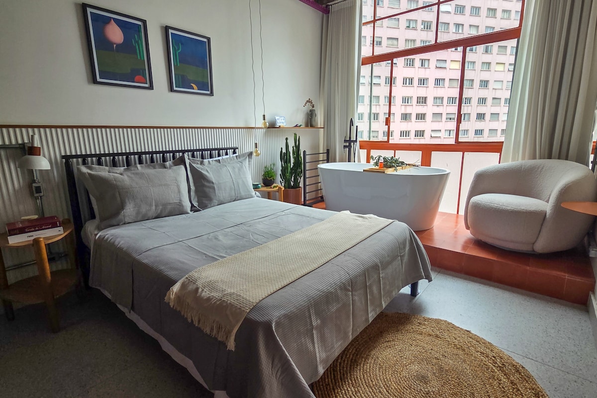 Espaço com todas as comodidades para estadias curtas ou prolongadas, tranquilo, completo e confortável, vista da cidade, sacada a céu aberto no 21o. andar de um edifício patrimônio arquitetônico dos anos 1950. Cozinha equipada, hidromassagem, Ar Cond quente/frio, água quente, TV QLED 50",enxoval fino completo, cama excelente, espaço de trabalho com internet Starlink, Echo-dot Alexa, este é um lugar especial para trabalho ou lazer, para renovar suas energias e estar perto de tudo em S. Paulo🥂