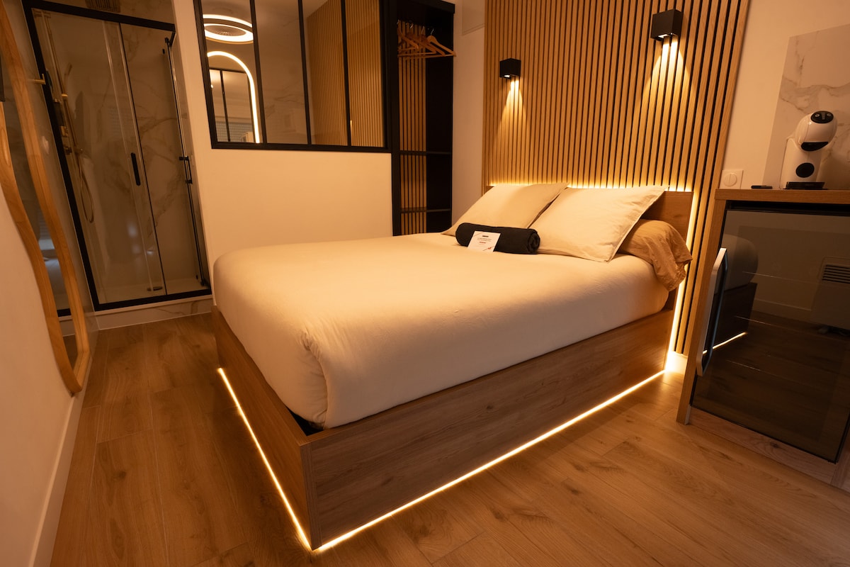 Suite élégante avec entrée indépendante, pensée pour un séjour confortable et sans contrainte. Vous découvrirez un studio moderne et chaleureux, mêlant bois naturel et éclairages doux pour une atmosphère immédiatement agréable. Literie confortable, salle d’eau soignée, Wi-Fi rapide, arrivée autonome : tout est réuni pour que vous vous sentiez bien dès votre arrivée, que ce soit pour une escapade à deux ou un déplacement professionnel.