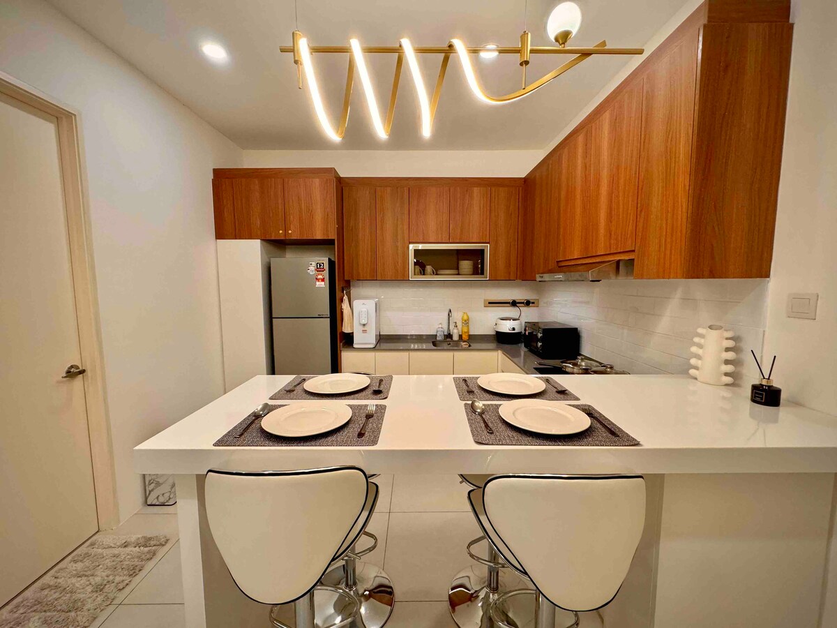 Relaxează-te cu întreaga familie în această locuință minimalistă elegantă, cu vedere uimitoare la munții emblematici din Kuching. Situată într-un cartier liniștit, dar vibrant, această locuință oferă o atmosferă liniștită și confortabilă. Este locul perfect pentru a te relaxa și a te bucura de natură, fiind în același timp aproape de aeroport, mall-uri și centrul orașului. Acest studio cu bucătărie poate găzdui până la 4 persoane, potrivit pentru cupluri, persoane care călătoresc în interes de afaceri, familie și prieteni. ★ Parcare gratuită (în funcție de disponibilitate), piscină pe acoperiș și acces la sala de fitness