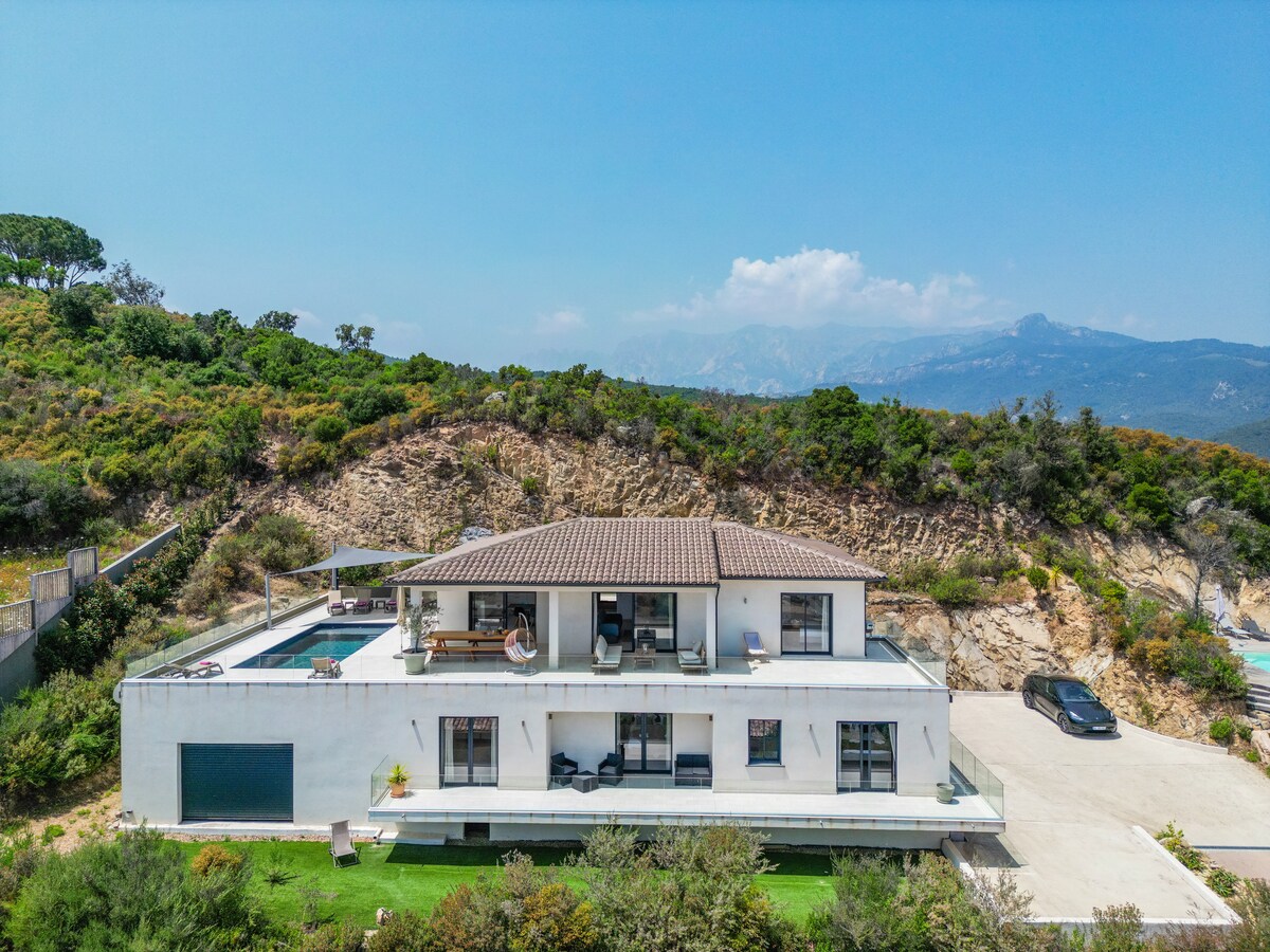 Vilă cu 3 dormitoare, cu aer condiționat, cu piscină privată încălzită/vedere superbă la mare, la 150 m de Golful Pinarello, grădină privată și adăposturi auto în fața vilei/masă de ping-pong, fotbal de masă/mingi în fața petanque și jocuri pentru copii Această locuință liniștită oferă un sejur relaxant pentru întreaga familie.