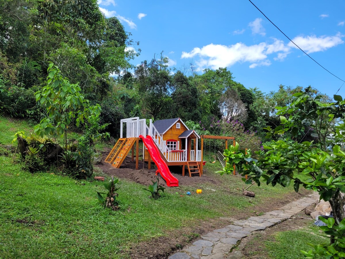 Pongo a tu disposición una linda Casa independiente con acceso a kiosko con asador, terraza con parasol, área de fogata, espacios para acampar, pequeño bosque de 1.000 mt2 con acceso a quebrada privada. Muchos árboles, pájaros y vida silvestre. La casa es confortable y muy bien dotada. Cuenta con una habitación con cama doble y baño, área social con sofacama, cocina con estufa, horno eléctrico, nevera, vajilla, utensilios de mesa y cocina completos. Lavadero exterior. Wifi, parqueo.