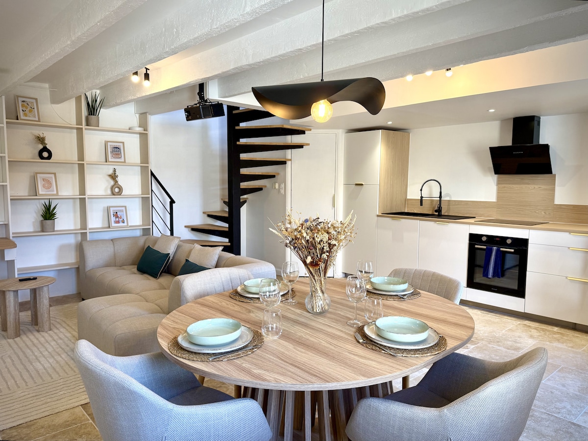 Apartament flexibil liniștit și „atipic” renovat la sfârșitul anului 2018, într-o clădire veche, la parter și etajul 1, în centrul orașului Le Palais, cu intrare independentă privată. Vei ajunge în living cu canapeaua sa galbenă și zona de cocon cu ecran plat. Lângă living, dormitorul spațios. Pentru a accesa podeaua, vei lua o scară frumoasă din lemn, te va duce la bucătăria luminoasă. Este complet echipată. La același etaj, camera de duș.