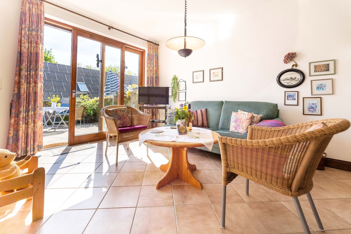 Die sonnige, Licht durchflutete Wohnung ″Scheunendiele″ liegt in einer ausgebauten Fachwerkscheune mit eigenem Garten und Sonnenterrasse. Geräumige 60 qm, Wohnzimmer mit offener, voll ausgestatteter Küche, bieten Raum für 2- 4 Personen. Der Essbereich ausgestattet für bis zu 4 Personen liegt neben dem Wohnbereich mit Couch und Sesseln und zusätzlicher Lese Ecke beim Kamin. Die beiden Schlafzimmer befinden sich in der oberen Etage, mit Blick in den wunderschönen Garten.
